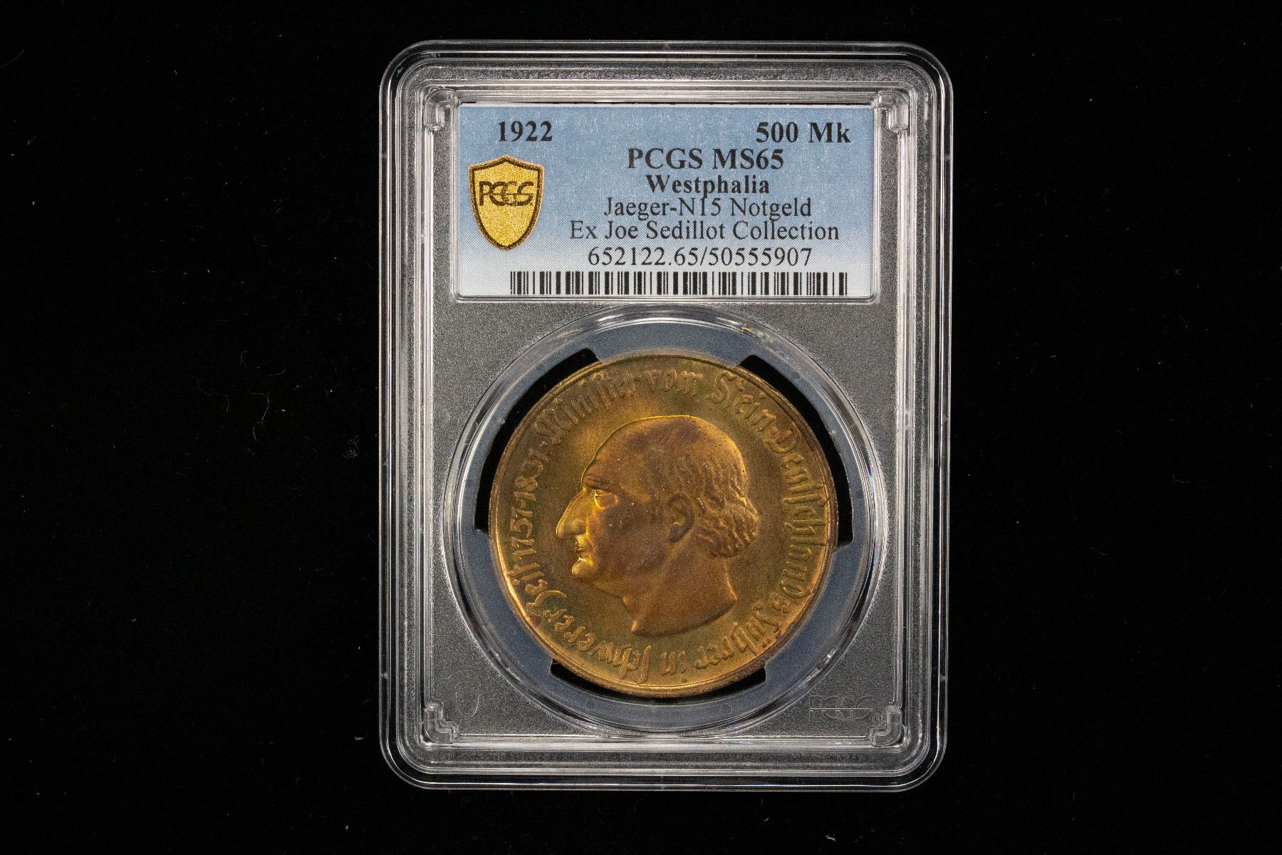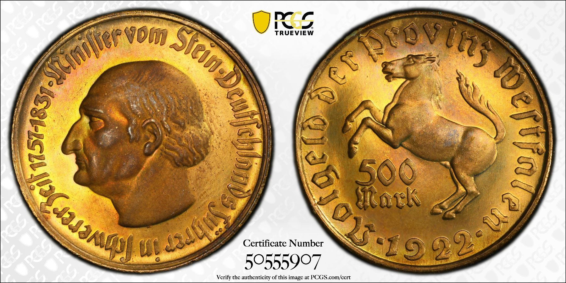 WESTPHALIA: 500 mark, 1922, J-N15, Funck-645.2, Men18-33512.8, tombac notgeld issue, the Saxon Steed from the Province of Westphalia // Heinrich Friedrich Karl vom und zum Stein portrait, a superb quality example! PCGS graded MS65, ex Joe Sedillot Collection.
