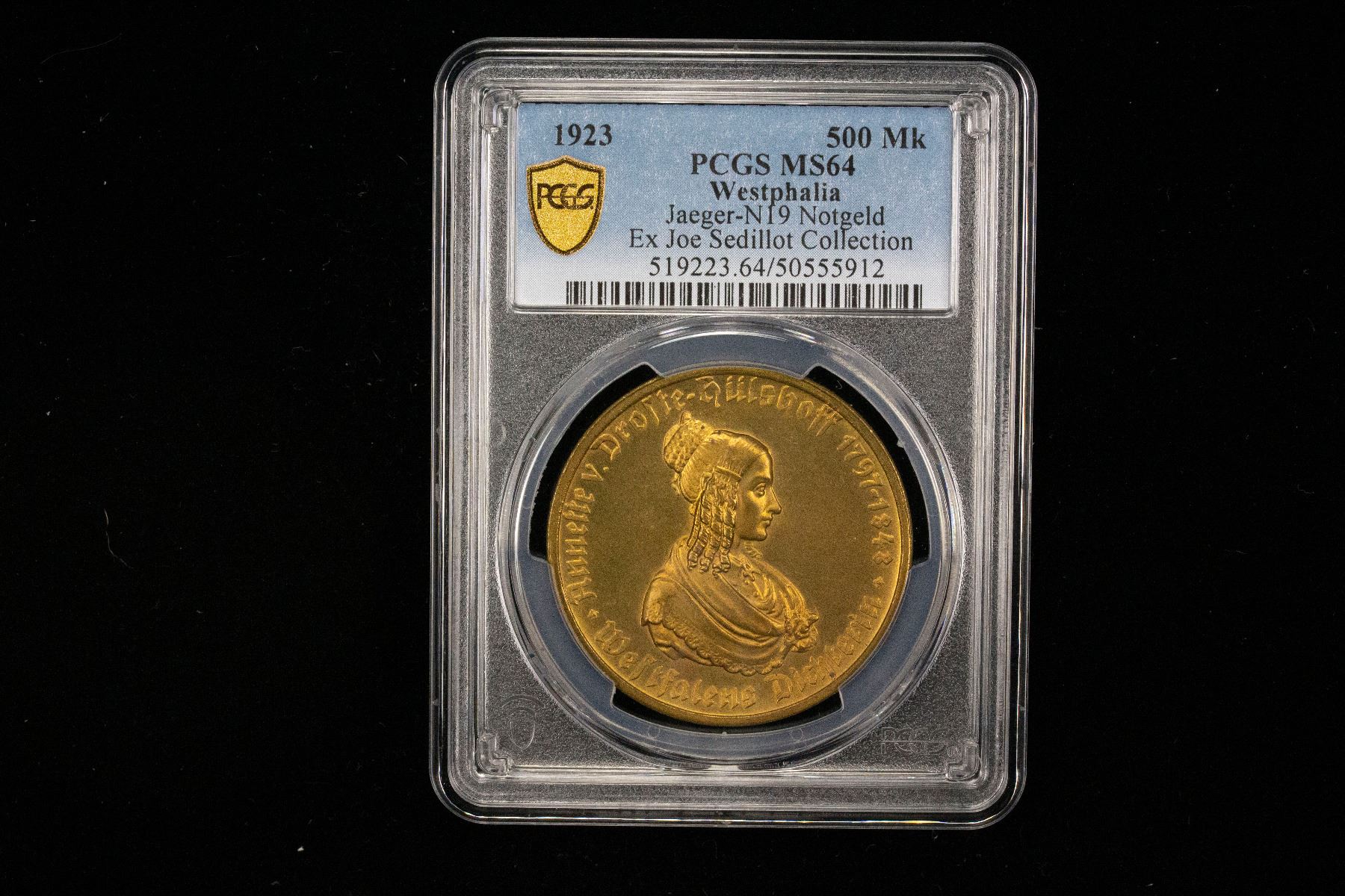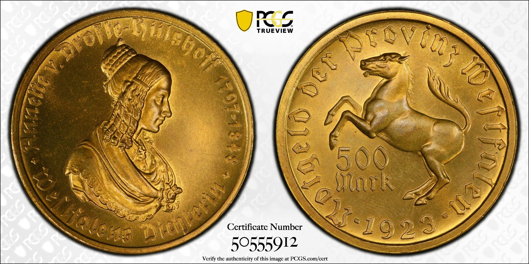 WESTPHALIA: 500 mark, 1923, J-N19, Funck-645.6, Men18-33512.15, tombac notgeld issue, the Saxon Steed from the Province of Westphalia // Annette von Droste-Hülshoff portrait, a wonderful quality example! PCGS graded MS64, ex Joe Sedillot Collection.