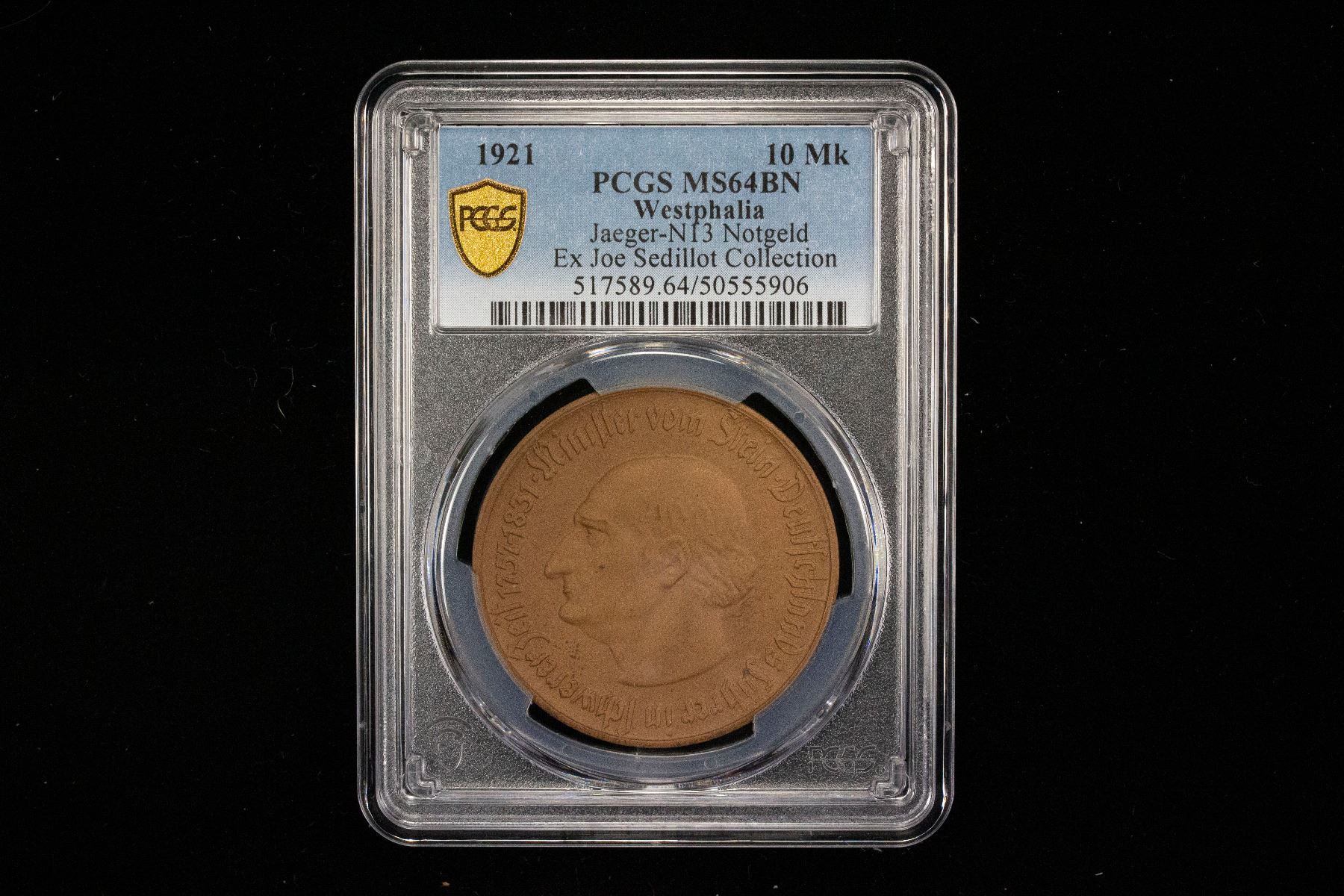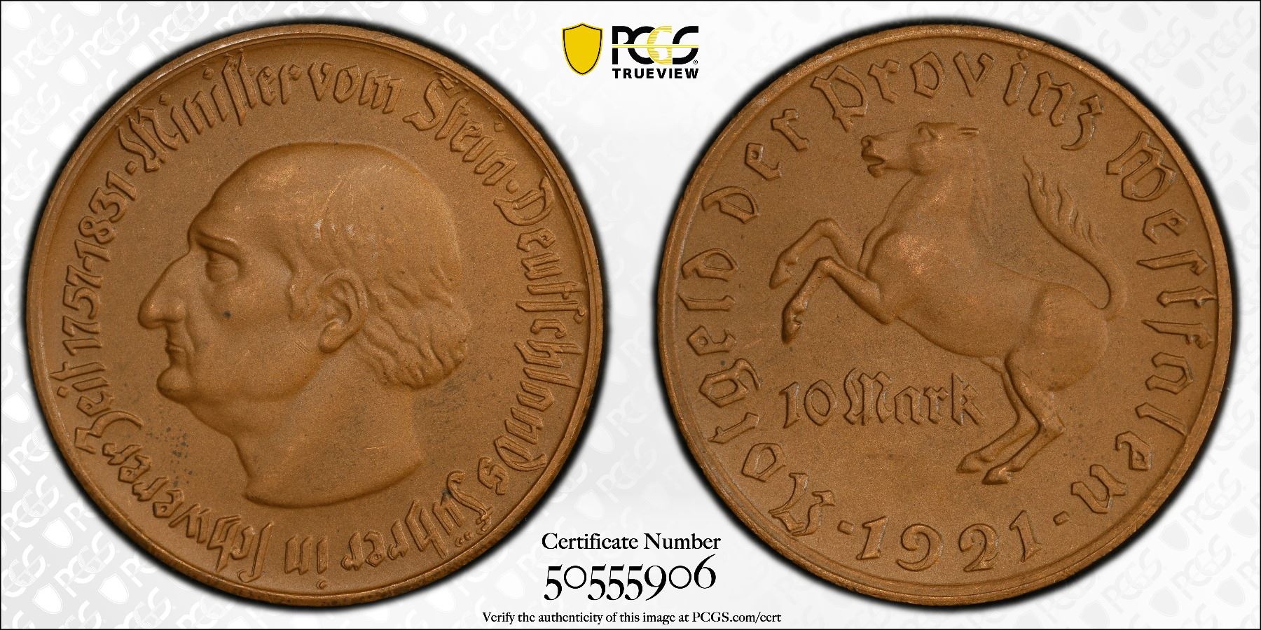 WESTPHALIA: AE 10 mark, 1923, J-N13, Funck-599.5, Men18-33512.5, bronze notgeld issue, the Saxon Steed from the Province of Westphalia // Heinrich Friedrich Karl vom und zum Stein portrait, a wonderful quality example! PCGS graded MS64 BN, ex Joe Sedillot Collection.