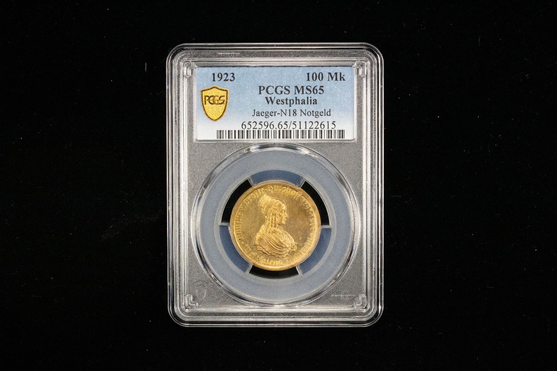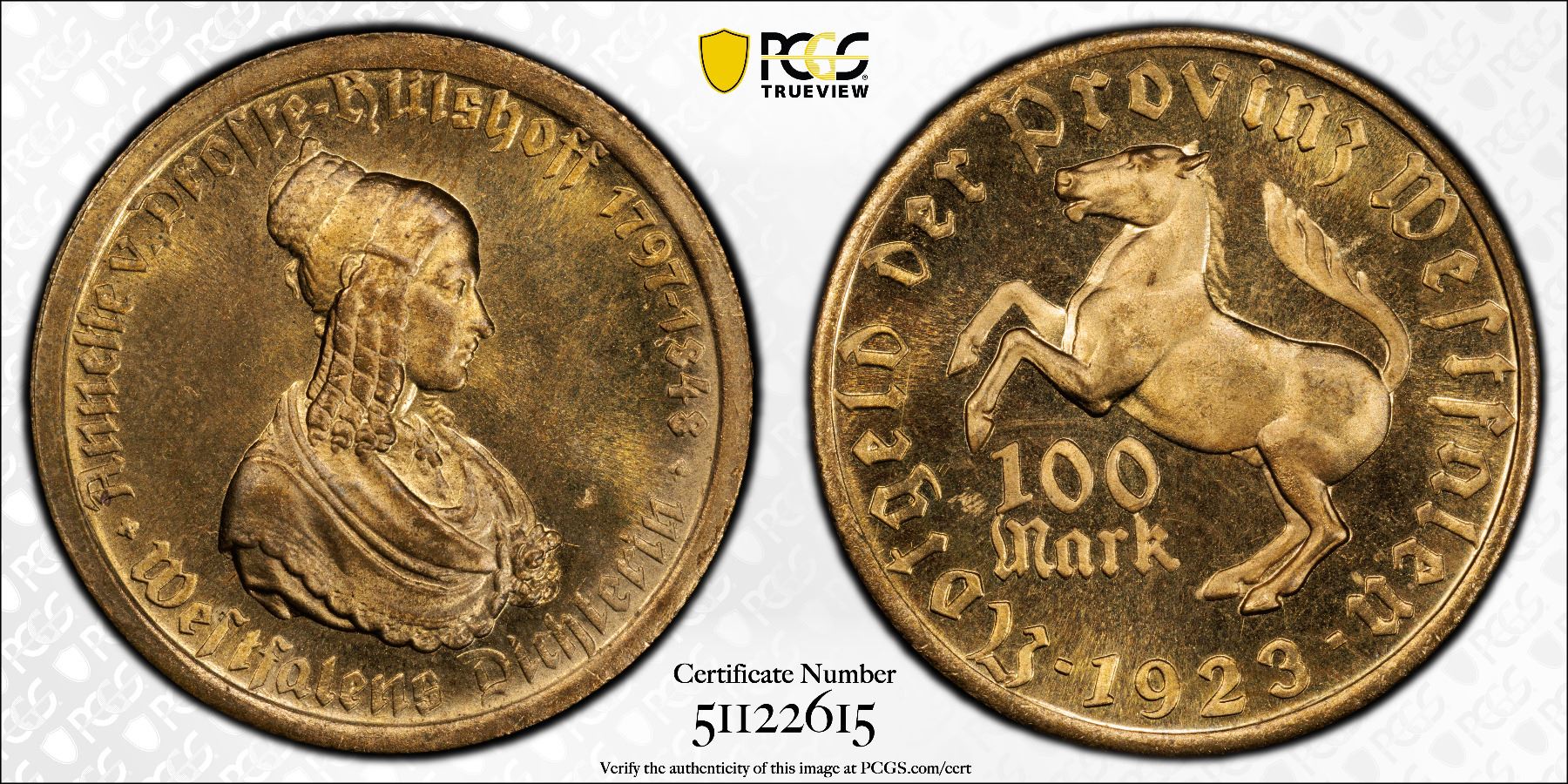 WESTPHALIA: AE 100 mark, 1923, J-N18, Funck-645.5, Men-33512.12, gilt tombac notgeld; Saxon Steed // Bust of Annette von Droste-Hülshoff, a superb quality example! PCGS graded MS65.