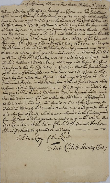 A fascinating early Connecticut document, 1p. legal folio, Hartford, Oct. 3, 1710, a "true copy" of a court decision in which Nathanael Hooker, a state legislator, is awarded one hundred acres "...of the Commons, or undivided wilderness land" held by the Town of Wethersfield, as the town and its repersentatives had failed to appear in court after having been noticed three times. Additionally, the town is held liable for Hooker's legal fees and court costs. A small chip at top costs two words of text, else very good. Wethersfield is a historic town: Washington and Rochambeau planned the battle of Yorktown there, and four witch trials and three executions for witchcraft occurred in the town in the 17th century.