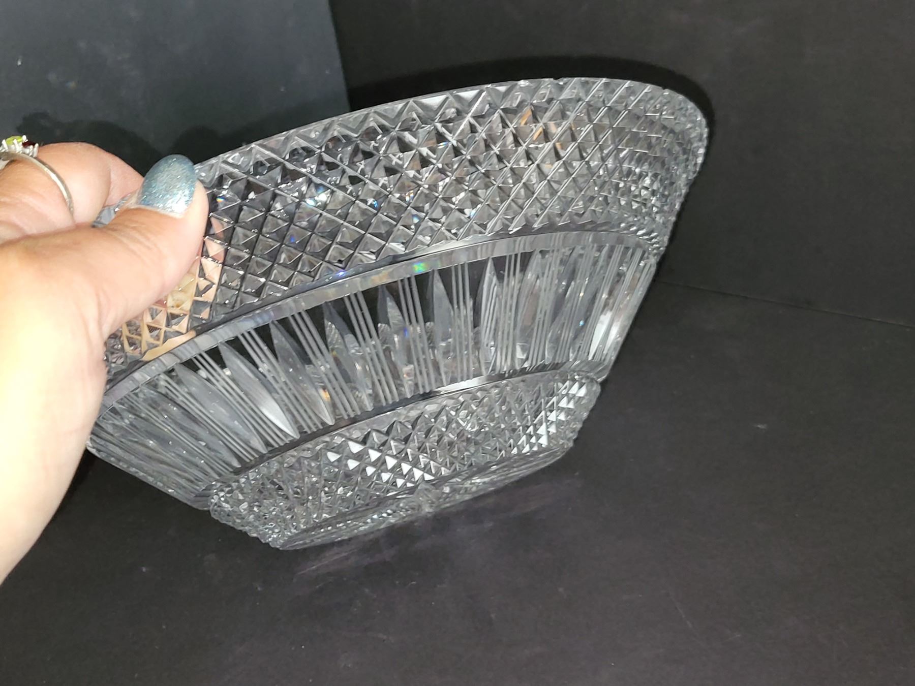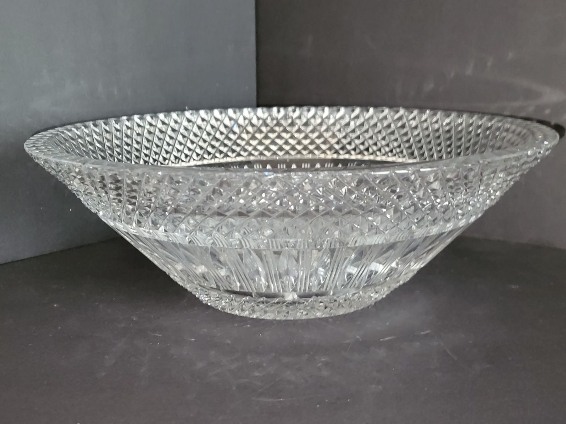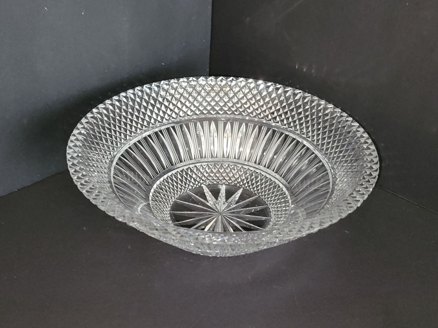 WEXFORD ANCHOR HOCKING CRYSTAL BOWL. MEASURES 8.75" WIDE 3.5" DEEP. HAS SOME MINOR CHIPS FROM WEAR
