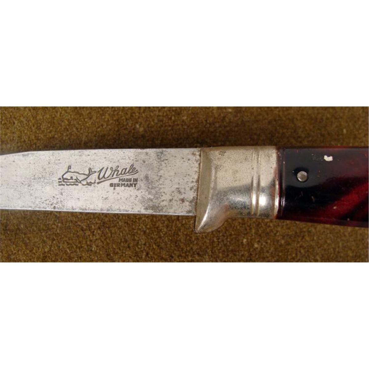 OFFERED HERE IS A GERMAN KNIFE IN DOUBLE SHEATH. THE MAKER'S MARK READS: WHALE, GERMANY. NEXT TO THE MAKERS MARK IS A WHALE LOGO. THE KNIFE HAS A FAUX WOOD METAL GRIP, IS IN GOOD CONDITION AND MEASURES OUT TO BE 9". * * *