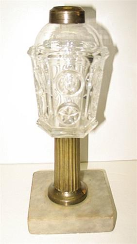 CLEAR GLASS WHALE OIL LAMP. Marble base with brass column stem. 9.5” H