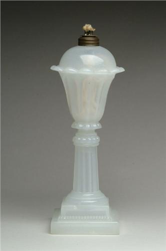 WHALE OIL LAMP. Beautiful clambroth whale oil lamp has two tier foot with fluted column and fluted and ribbed font. Lamp has twin tube burner. SIZE: 13 in. t. CONDITION: Chip to flute on pillar, one petal on font has been broken and repaired. Estate of Jon Heiden and Donald Mooers 5-60701