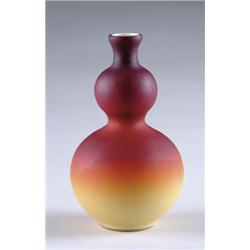 Lot 16 WHEELING PEACH BLOW DOUBLE GOURD VASE Double gourd vase has wonderful color of deep rich fuschia at the top shading to yellow amber at bottom. Nice even color separation. Vase is finished in a matte finish. SIZE: 7-1/2” t. CONDITION: Small chip to rim with tight hairline extending from chip approx. 2” down the neck. 5-70393