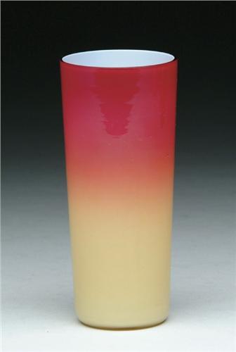 WHEELING PEACH BLOW TUMBLER. Outstanding Wheeling Peach Blow tumbler is fuschia shading to amber with a creamy white lining. SIZE: 5-1/4 in. t. CONDITION: Very good to excellent. 5-60262
