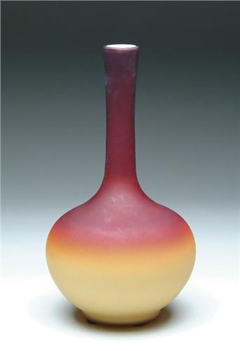WHEELING PEACH BLOW VASE. Wonderful Wheeling Peach Blow stick vase has deep rich color, nice graduation and acid matte finish. SIZE: 10-1/2 in. t. CONDITION: Very good to excellent. 5-61007