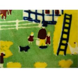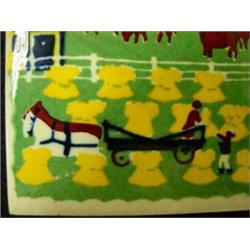 Wheeling hand painted tile with farm scene. Bright colors and lots of interesting detail. 6" x 6". Marked on back. Condition: Slight crazing, otherwise good.
