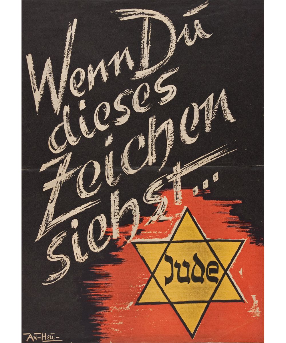 Chilling propaganda flyer, 4pp. large 4to., [n.p., n.d.] bearing on the cover the infamous yellow Star of David with "Jude" printed within, worn by Jews in Germany, with the bold exclamation above : "When you see this sign...". Within, the text continues: Remember what the Jew did to our people...Now it is openly said for the first time what World Jewry wants: 'Death to Germany'...Theodore Nathan Kaufman, President of the American Peace Union, Speaker for World Jewry, in his book publicly exclaimed 'Germany must perish and disappear forever from the planet Earth...'...Judah has decided on the deaths of you and your children...The German Wehrmach will ensure that the terrible, gruesome plan of World Jewry which the Jew Kaufman pronounced to the world will never become a reality...Recognize the true enemy!...". One horizontal bend, else very good.