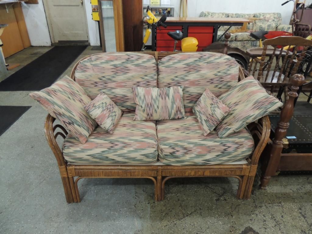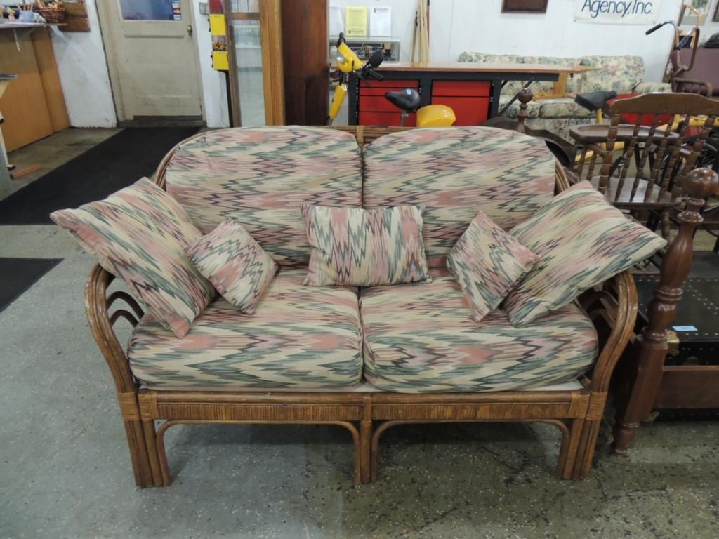 WHICKER RATTAN LOVE SEAT WITH CUSHIONS AND PILLOWS. 54" LONG AS SHOWN SEE PHOTO FOR MORE DETAILS.