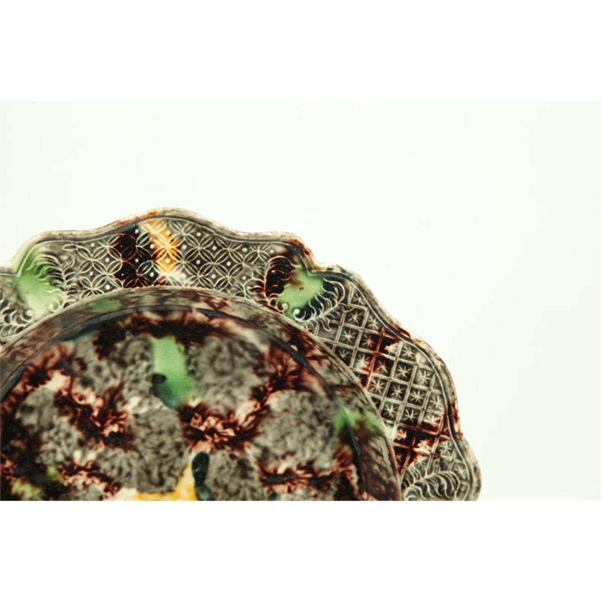 England, 2nd half-18th century, creamware. Scalloped and molded rim with tortoise-shell glaze in good colors. 9 1/2"d.