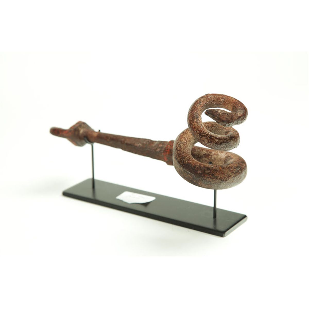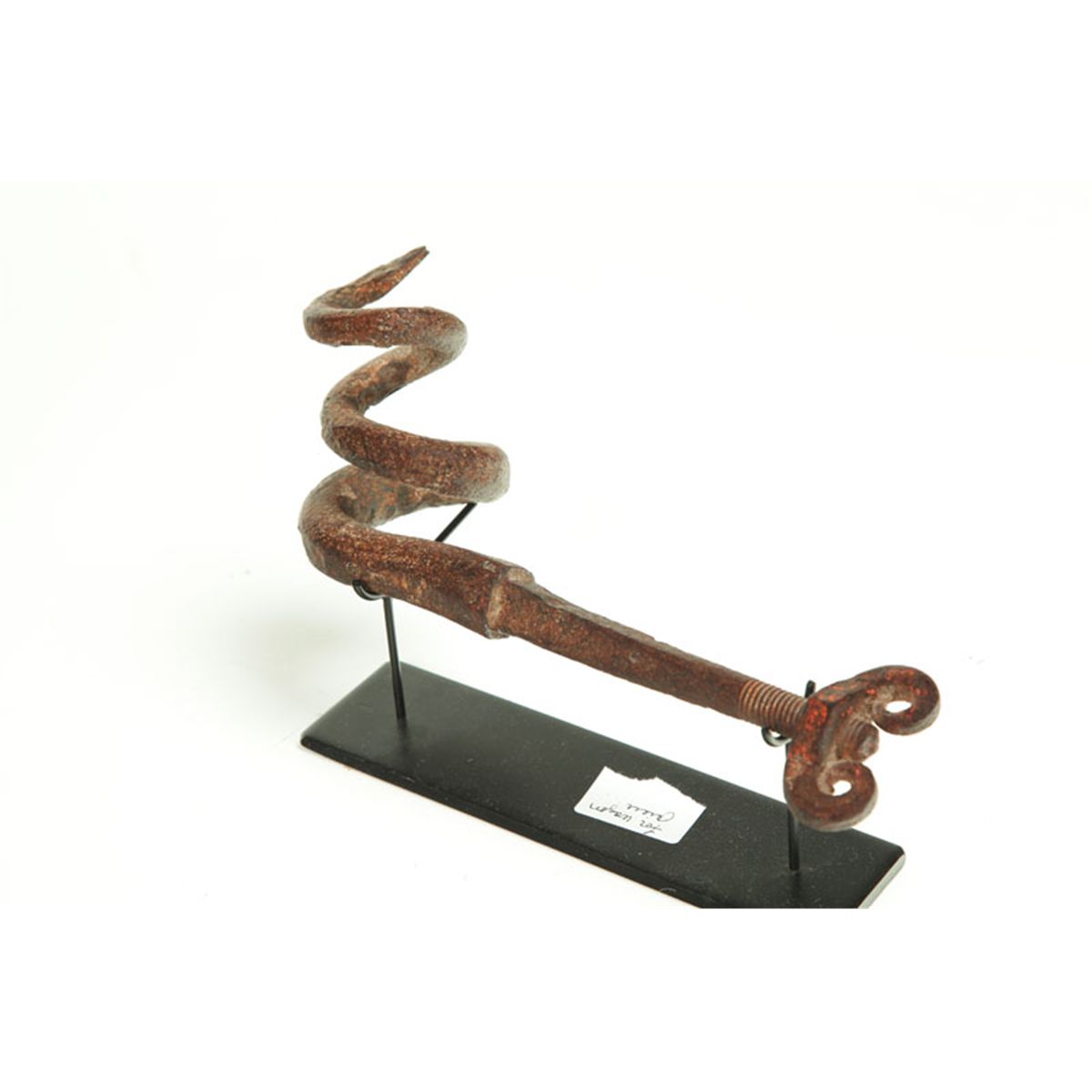 American, 19th century, wrought iron. In the form of a coiled snake with a ram's horn nut. Expected pitting and corrosion. 9 1/2"l. With modern stand.