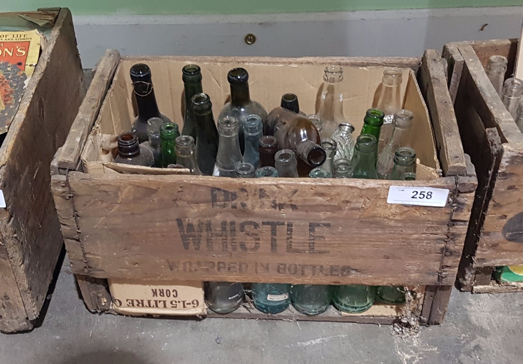 WHISTLE WOODEN POP CRATE W/MISC POP BOTTLES