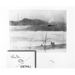 (1834 - 1903) American artist, a portrait painter with a pugnacious attitude best remembered for the portrait of his mother seated in a rocker. A superb Whistler piece, a photograph of his paintings, 10" x 7" (with mat, 20" x 15"), showing two figures against a peaceful seaside setting, signed beneath the image on mat in pencil "Whistler" and adding his usual Butterfly paraph. In near fine condition, ideal for framing.