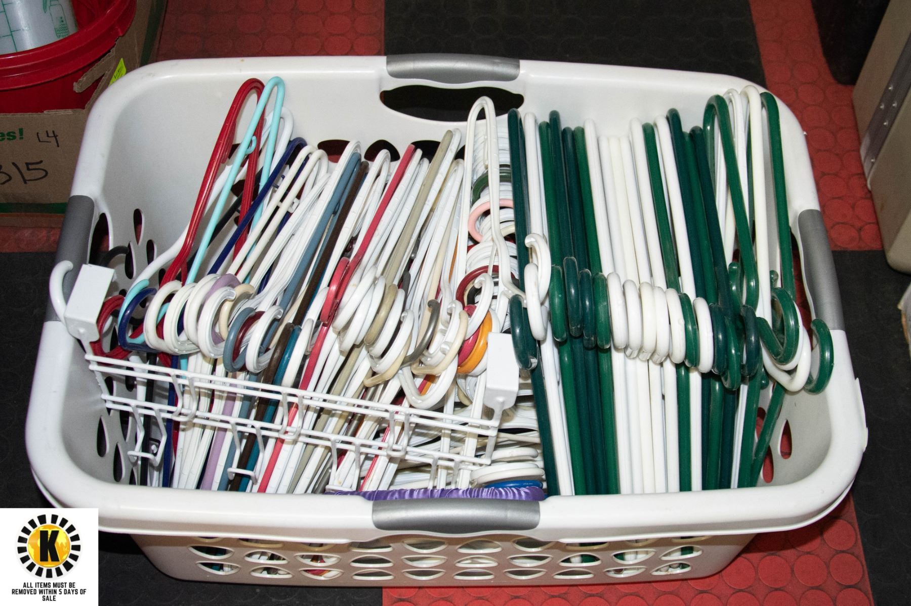 WITH OVER 100 PLASTIC HANGERS AND WHITE METAL DOOR HANGER **ALL ITEMS MUST BE REMOVED BY 5PM SATURDAY, APRIL 22ND, 2023. ALL REMAINING ITEMS WILL BE SUBJECT TO A $6.00 PER DAY STORAGE CHARGE. ANY ITEMS REMAINING AFTER MONDAY, MAY 8TH, 2023 WILL BE CONSIDERED FORFEITED. NO REFUNDS WILL BE ISSUED FOR FORFEITED ITEMS.** TO SCHEDULE A PICK UP APPOINTMENT CLICK HERE