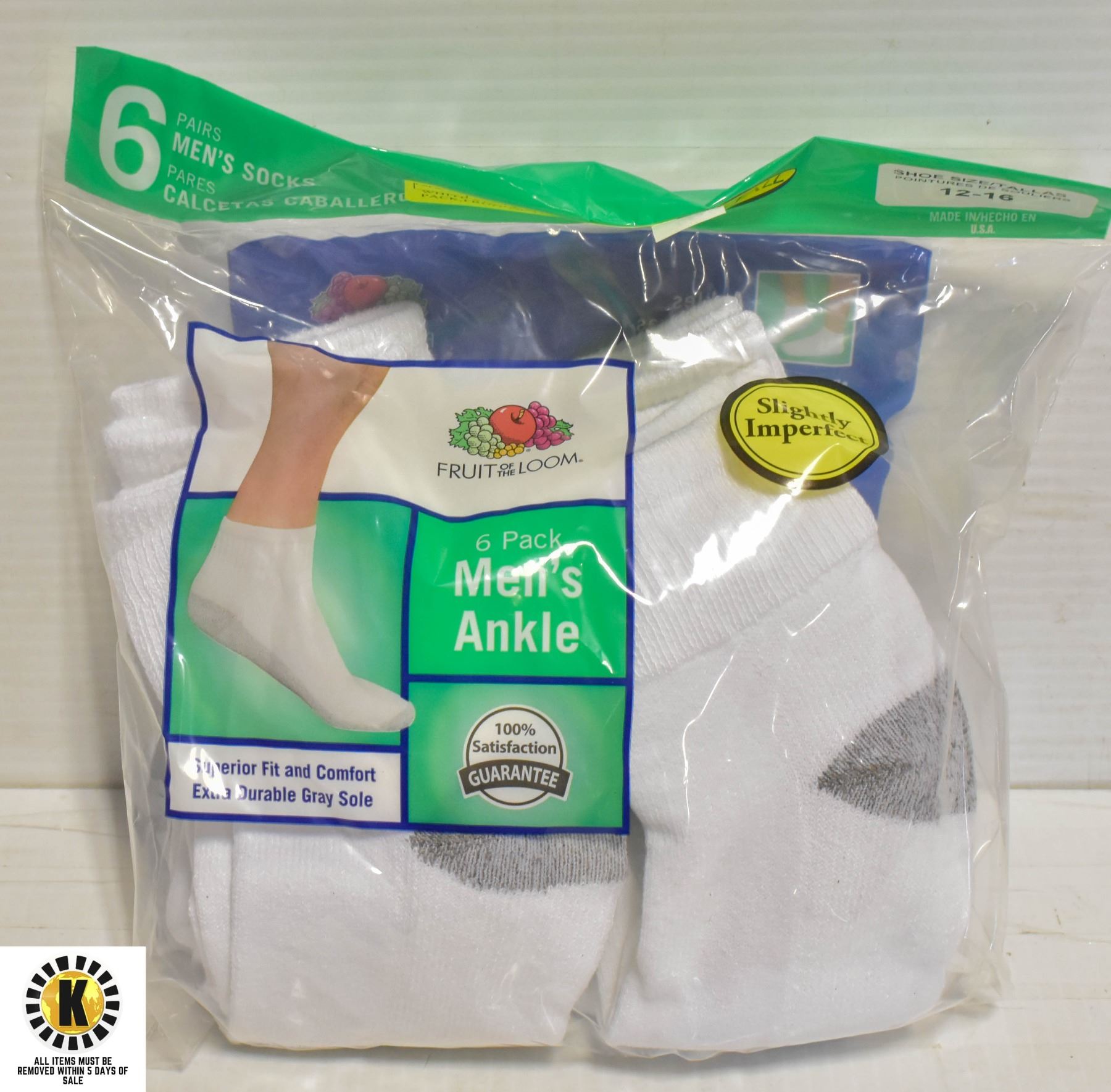 WHITE ANKLE SOCKS,SIZE 12-16,6 PACK,FRUIT OF THE