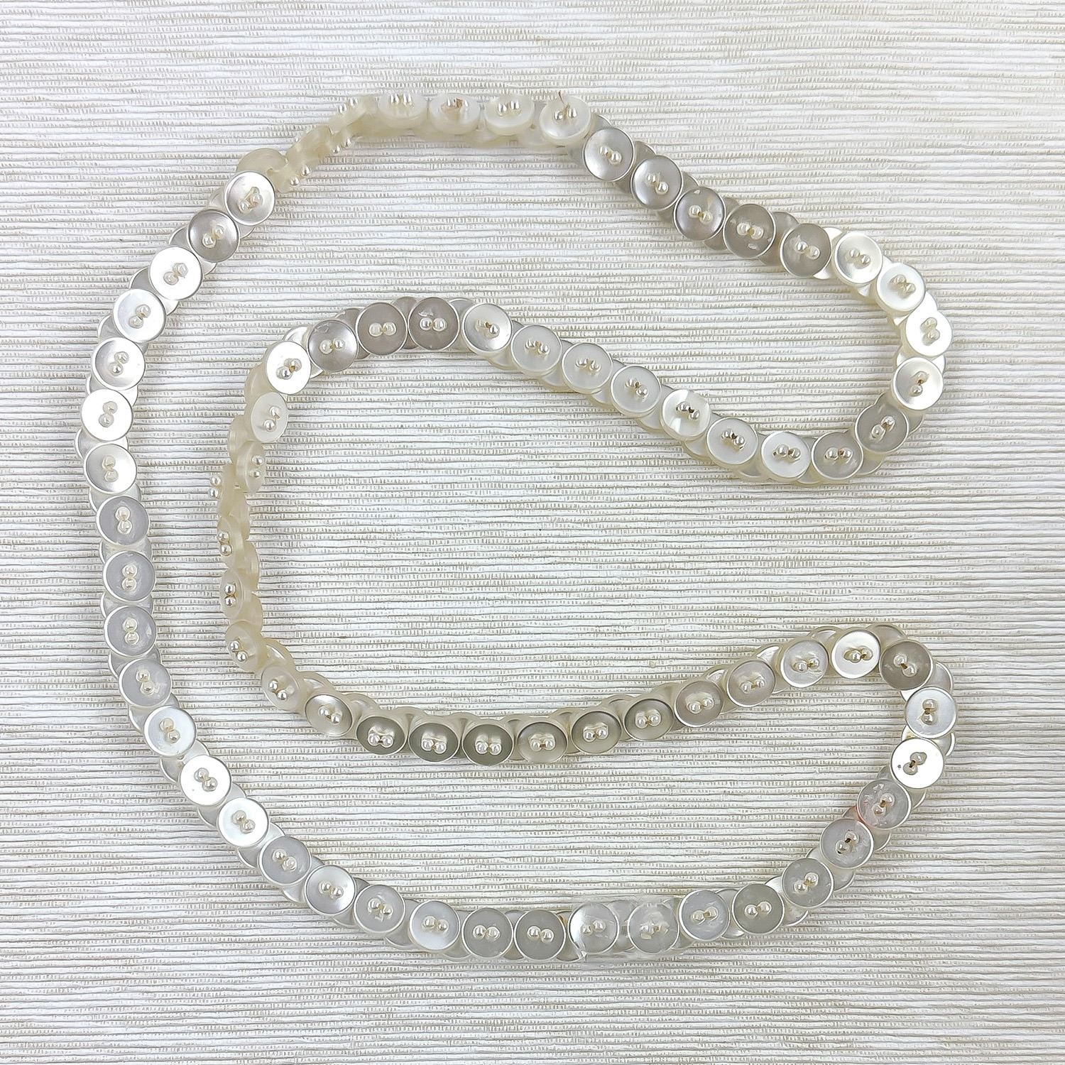 #8692 - UNMARKED - AGE AND MAKER UNKNOWN. BACK-TO-BACK WHITE BUTTON COSTUME JEWELRY NECKLACE. MEASURES: 17” (43 CM) LONG - TOTAL LENGTH IS TWICE THAT AT 34” (86 CM) LONG. THERE IS NO HOOK OR CLASP - IT JUST GOES AROUND YOUR NECK