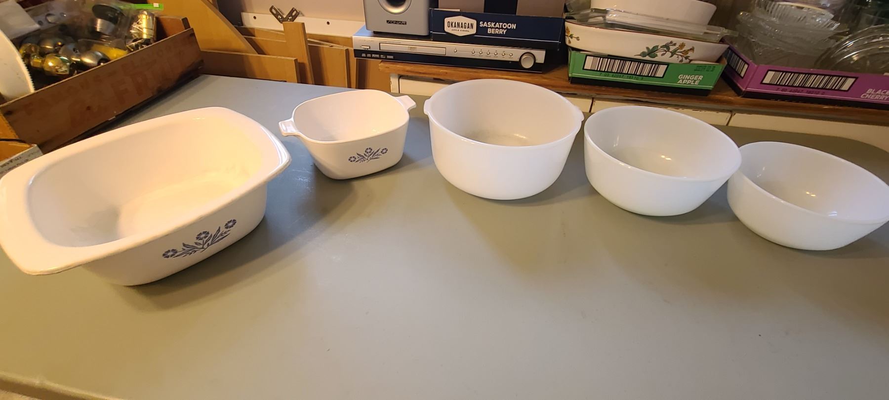 WHITE CERAMIC OVENWARE (2-CORNING WARE/3-ANCHOR FIRE KING)