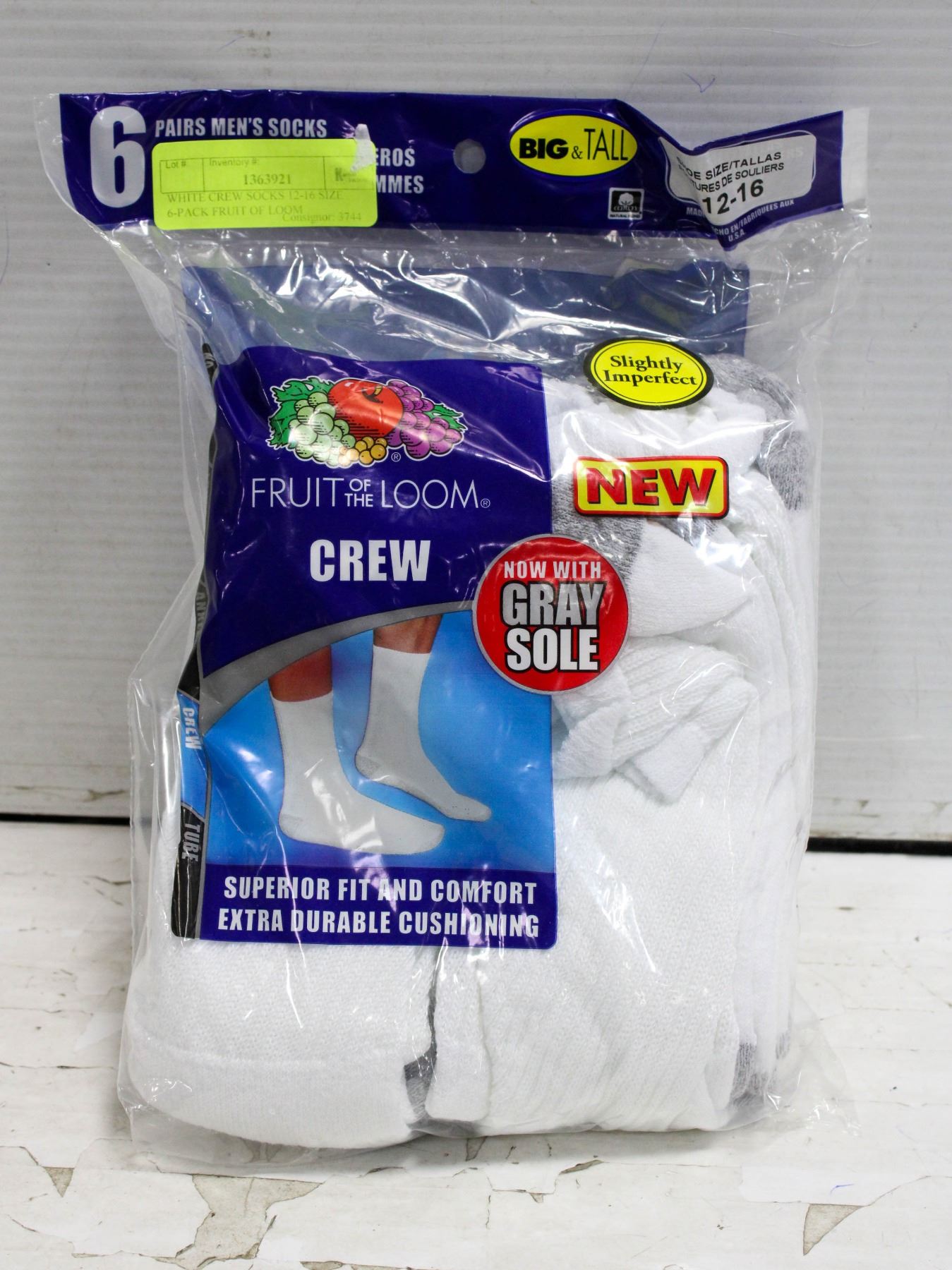 WHITE CREW SOCKS 12-16 SIZE 6-PACK FRUIT OF LOOM