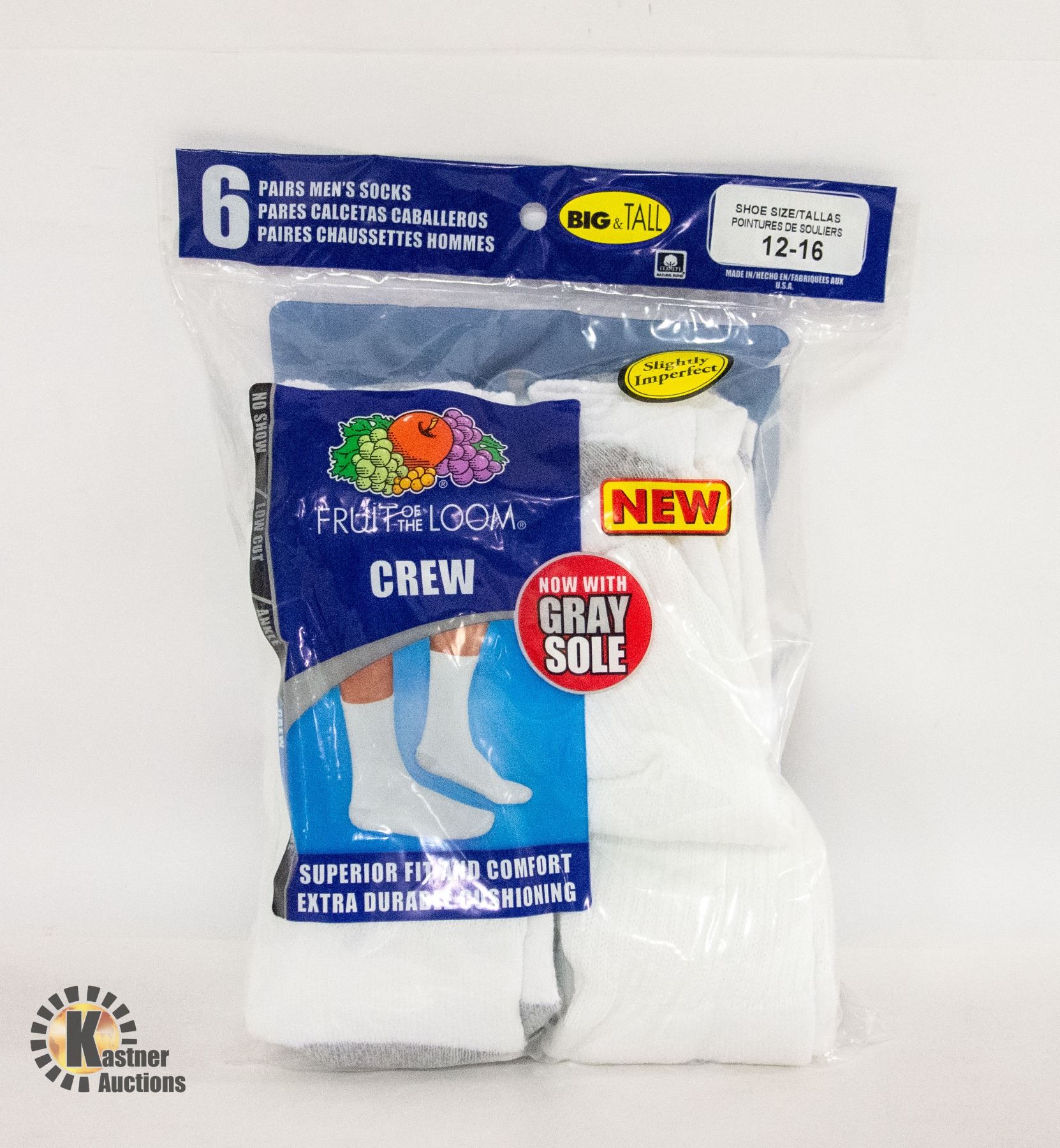 WHITE CREW SOCKS 12-16 SIZE 6-PACK FRUIT OF LOOM