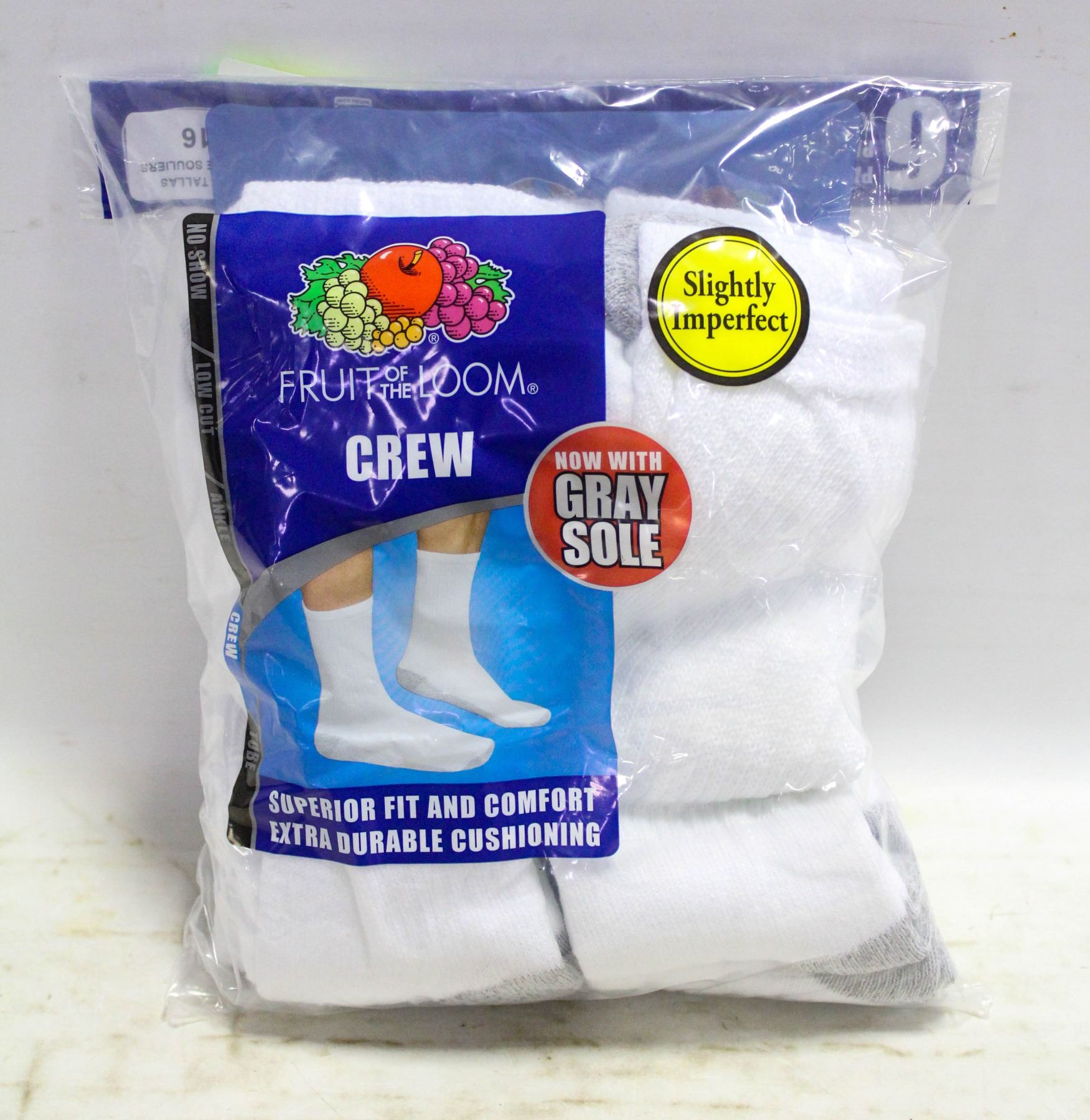 WHITE CREW SOCKS 12-16 SIZE 6-PACK FRUIT OF THE LO