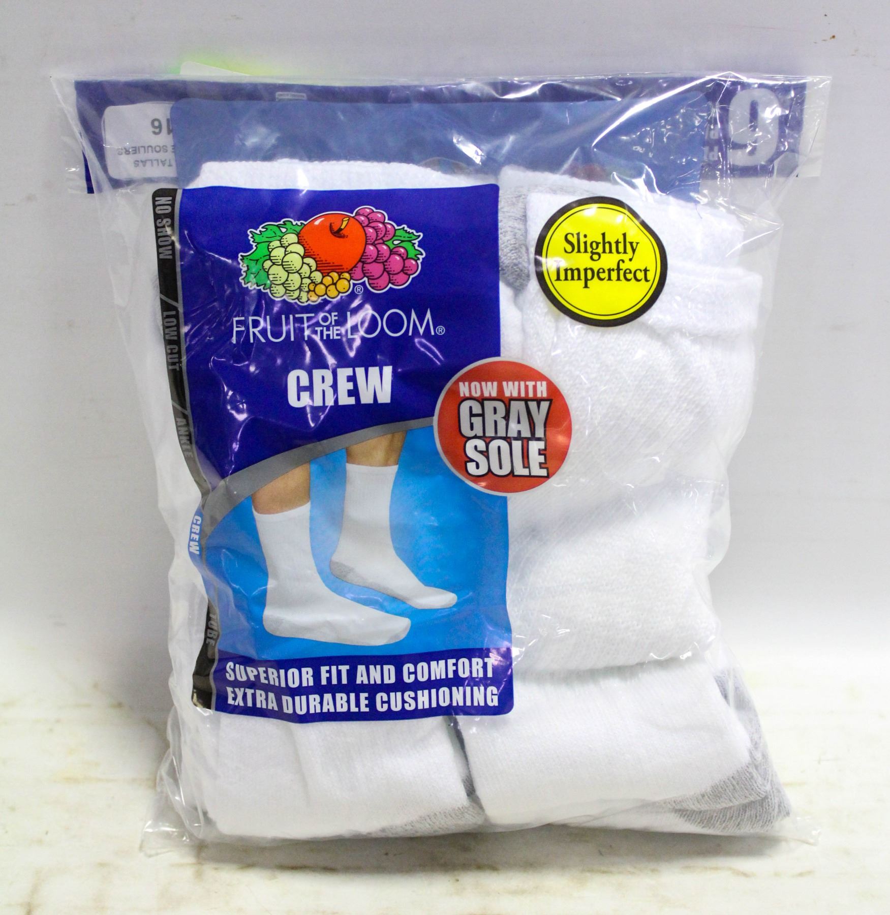 WHITE CREW SOCKS 12-16 SIZE 6-PACK FRUIT OF THE LO