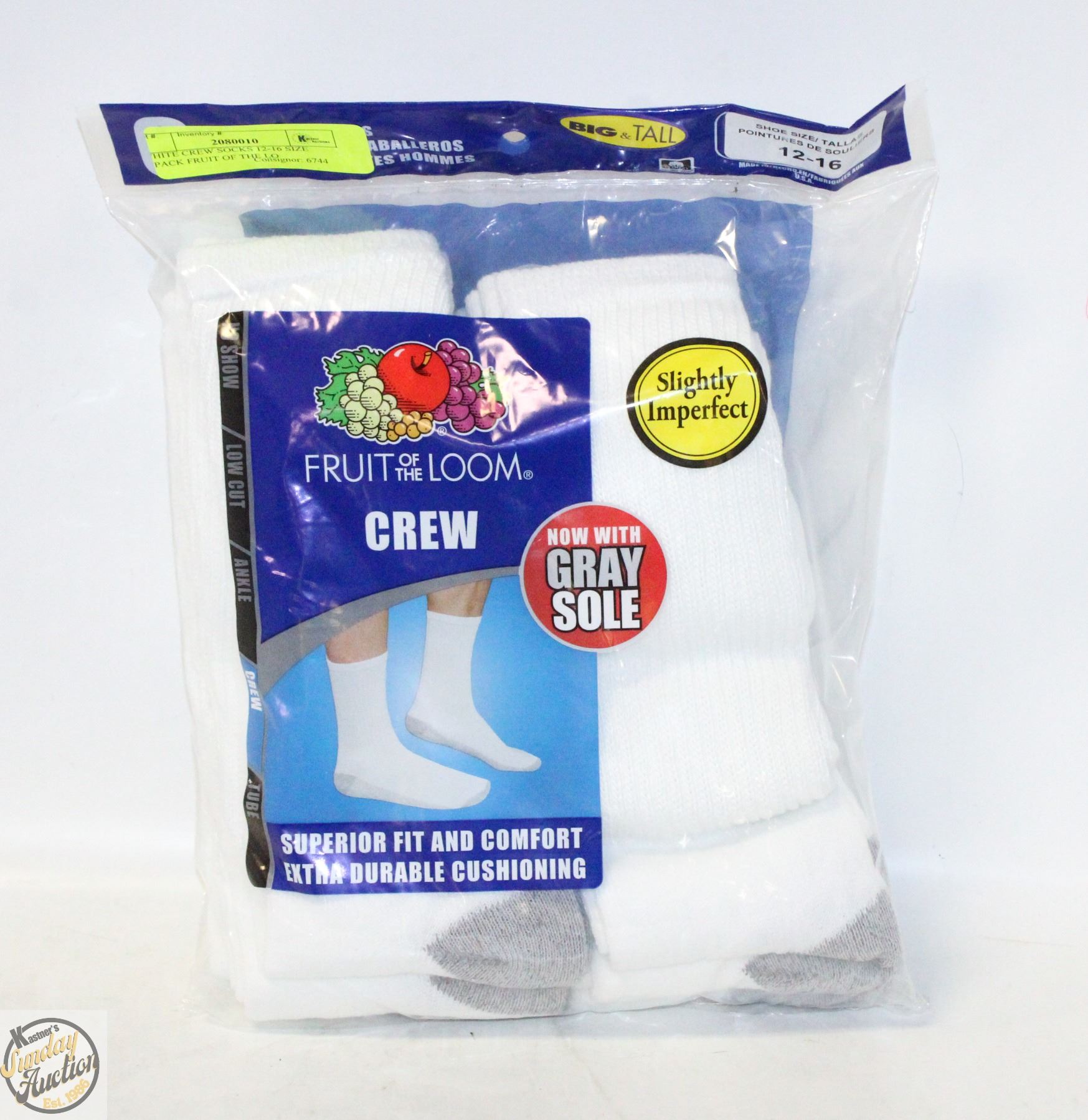 WHITE CREW SOCKS 12-16 SIZE 6-PACK FRUIT OF THE