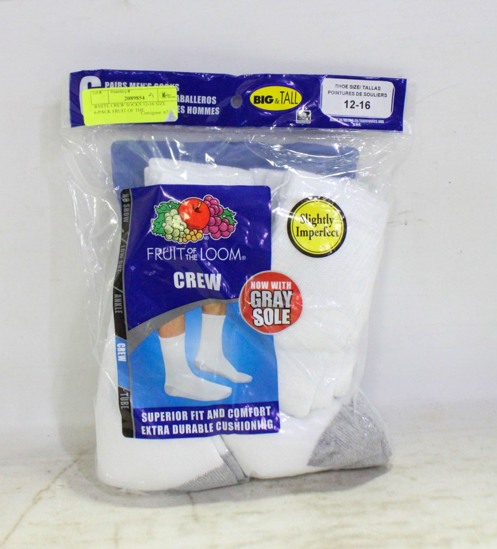WHITE CREW SOCKS 12-16 SIZE 6-PACK FRUIT OF THE