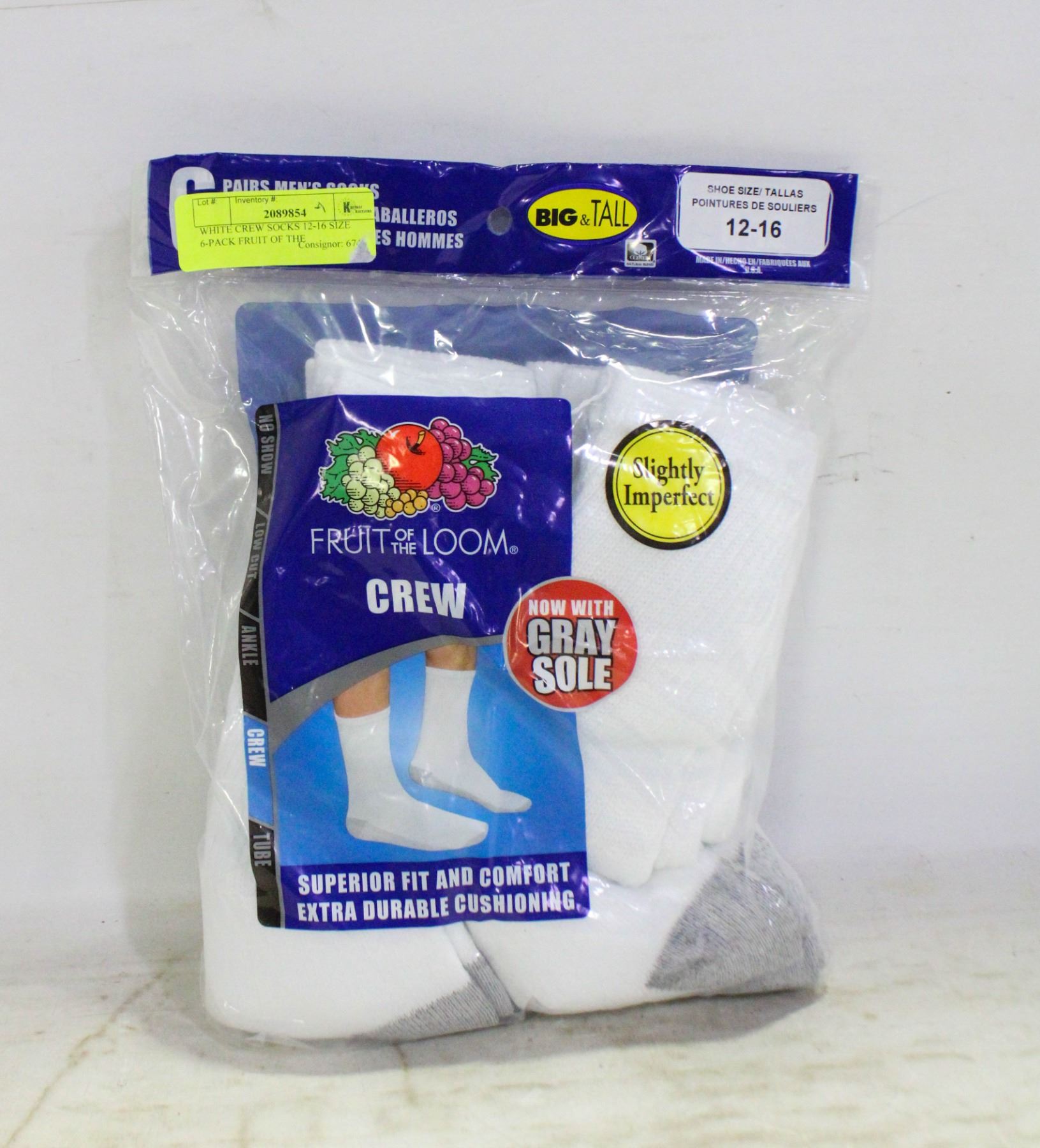 WHITE CREW SOCKS 12-16 SIZE 6-PACK FRUIT OF THE