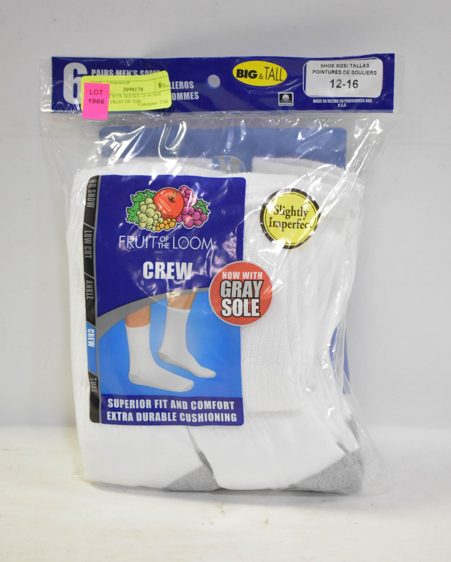 WHITE CREW SOCKS 12-16 SIZE 6-PACK FRUIT OF THE