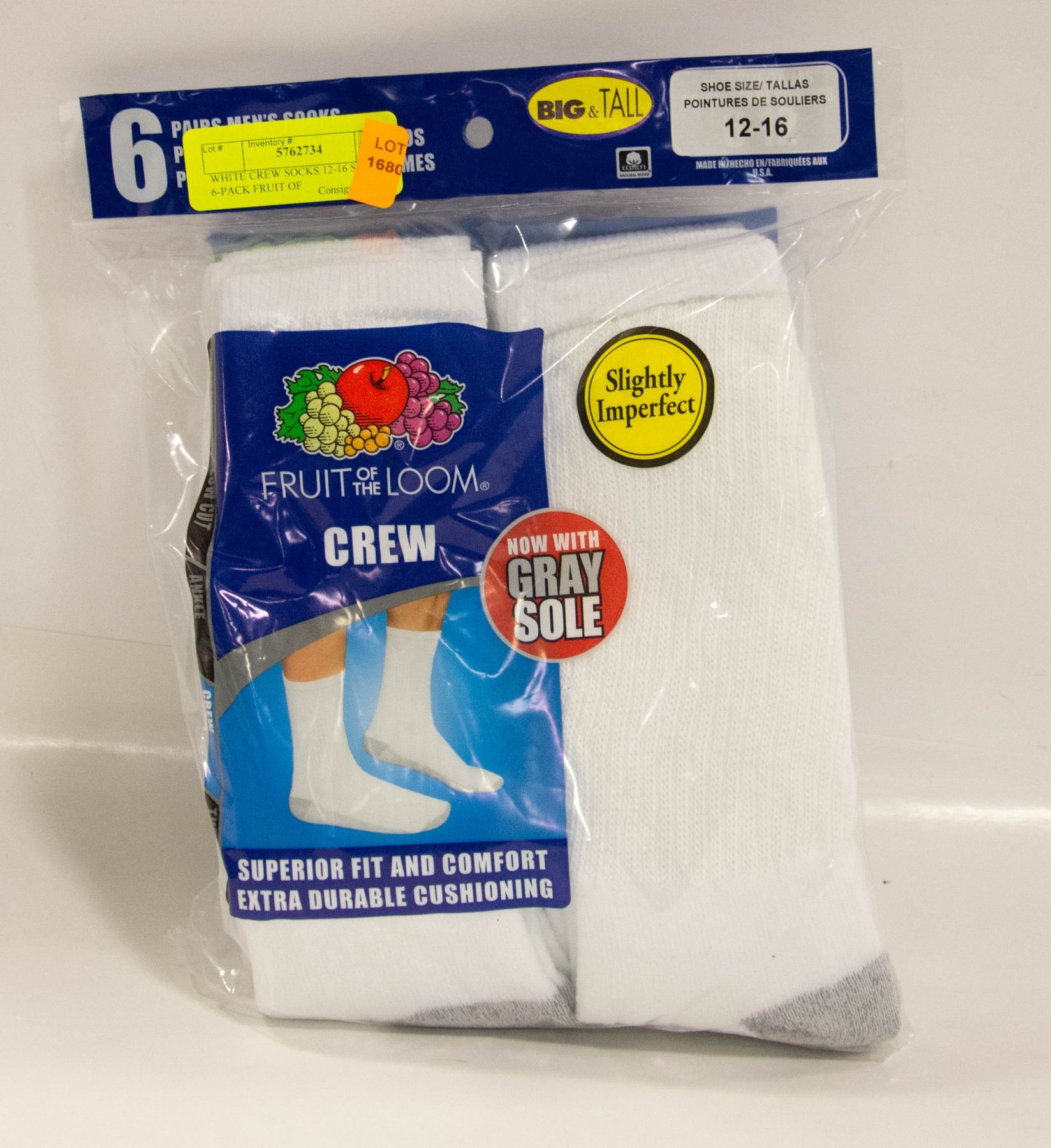 WHITE CREW SOCKS 12-16 SIZE 6-PACK FRUIT OF