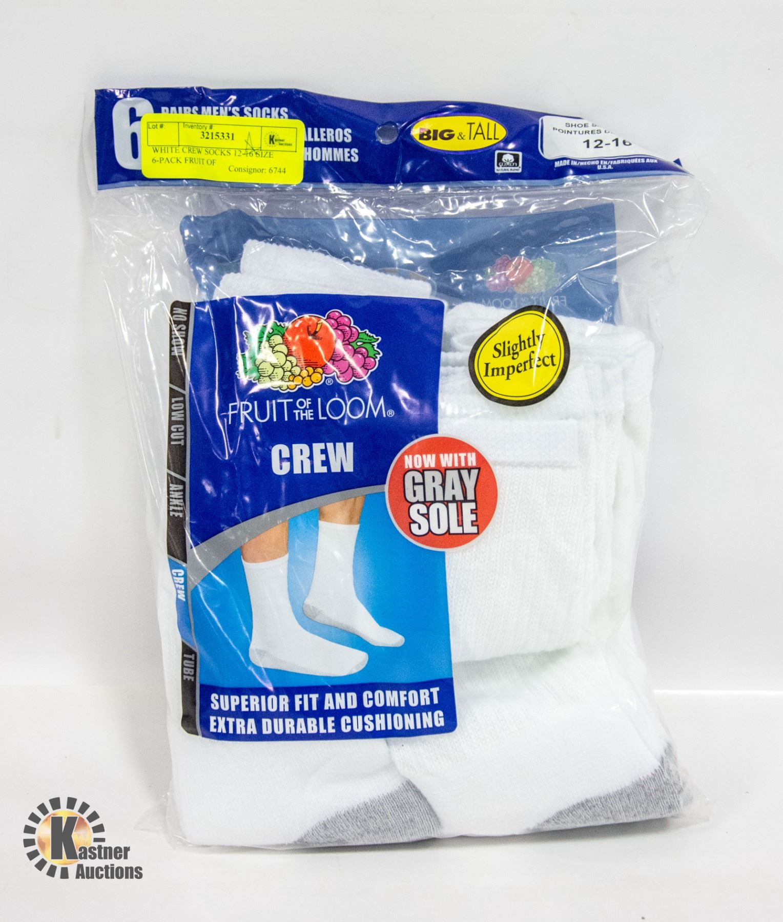WHITE CREW SOCKS 12-16 SIZE 6-PACK FRUIT OF