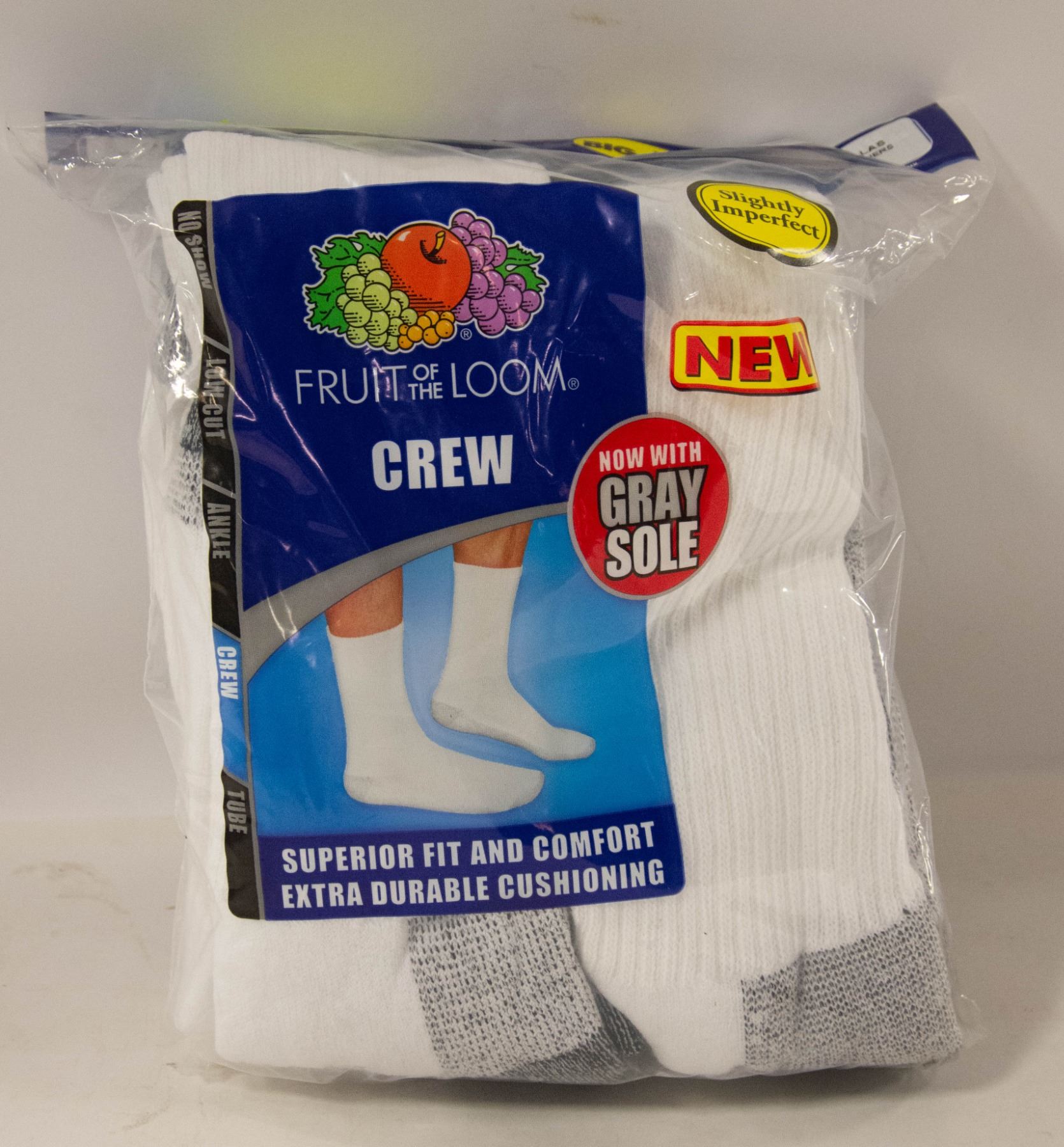 WHITE CREW SOCKS 12-16 SIZE 6-PACK FRUIT OF
