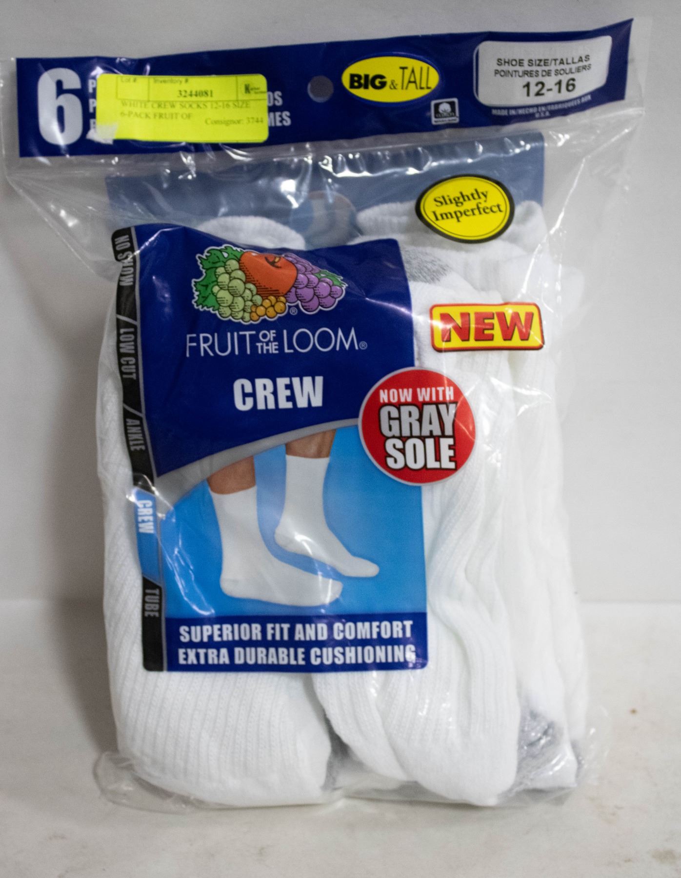WHITE CREW SOCKS 12-16 SIZE 6-PACK FRUIT OF