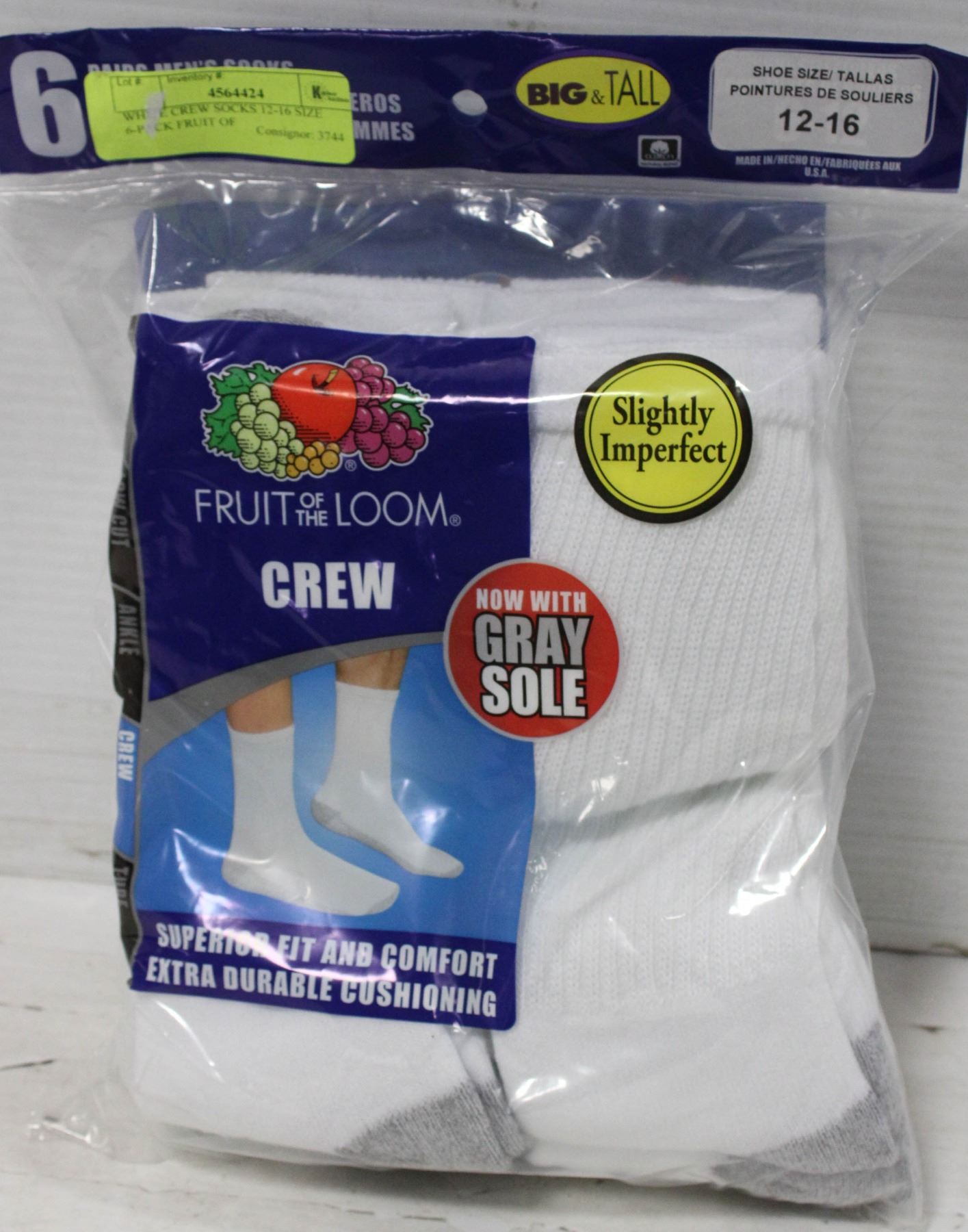 WHITE CREW SOCKS 12-16 SIZE 6-PACK FRUIT OF