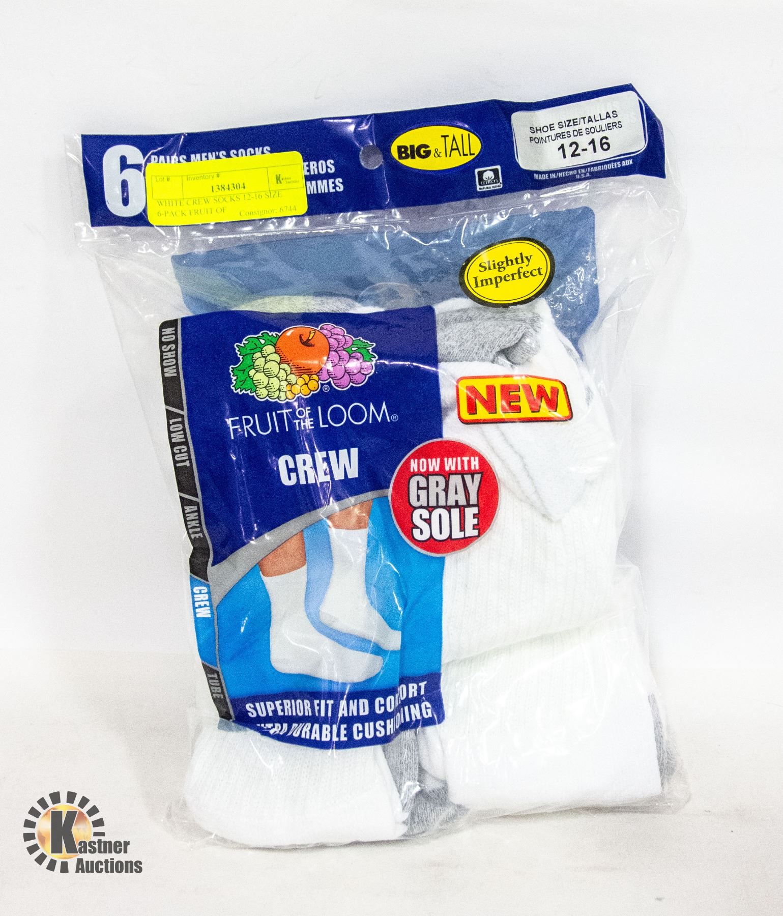 WHITE CREW SOCKS 12-16 SIZE 6-PACK FRUIT OF