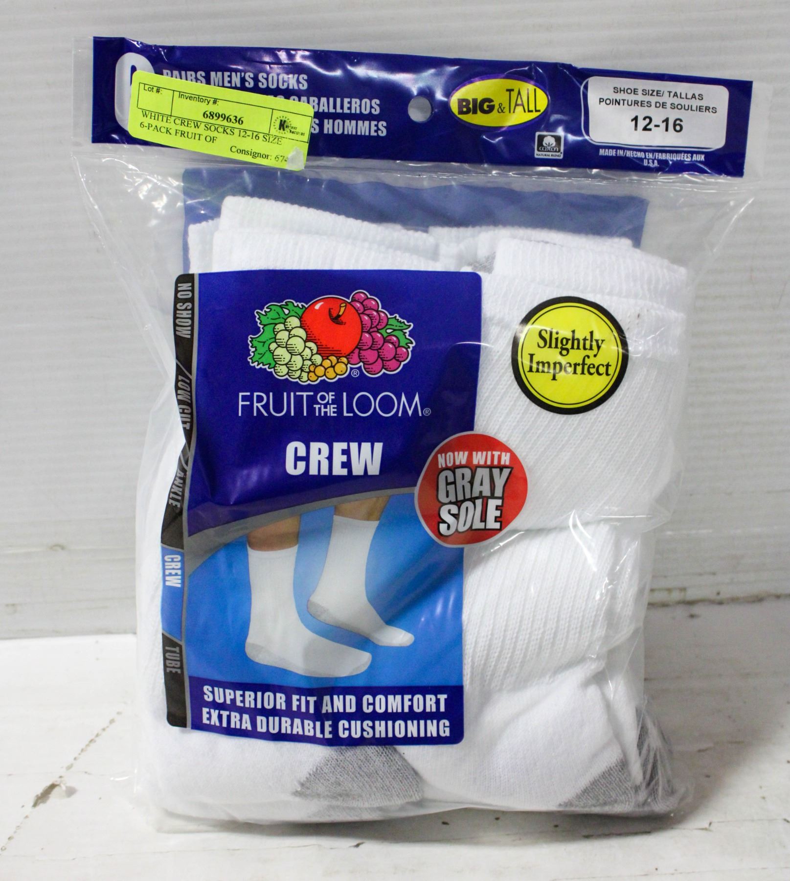 WHITE CREW SOCKS 12-16 SIZE 6-PACK FRUIT OF