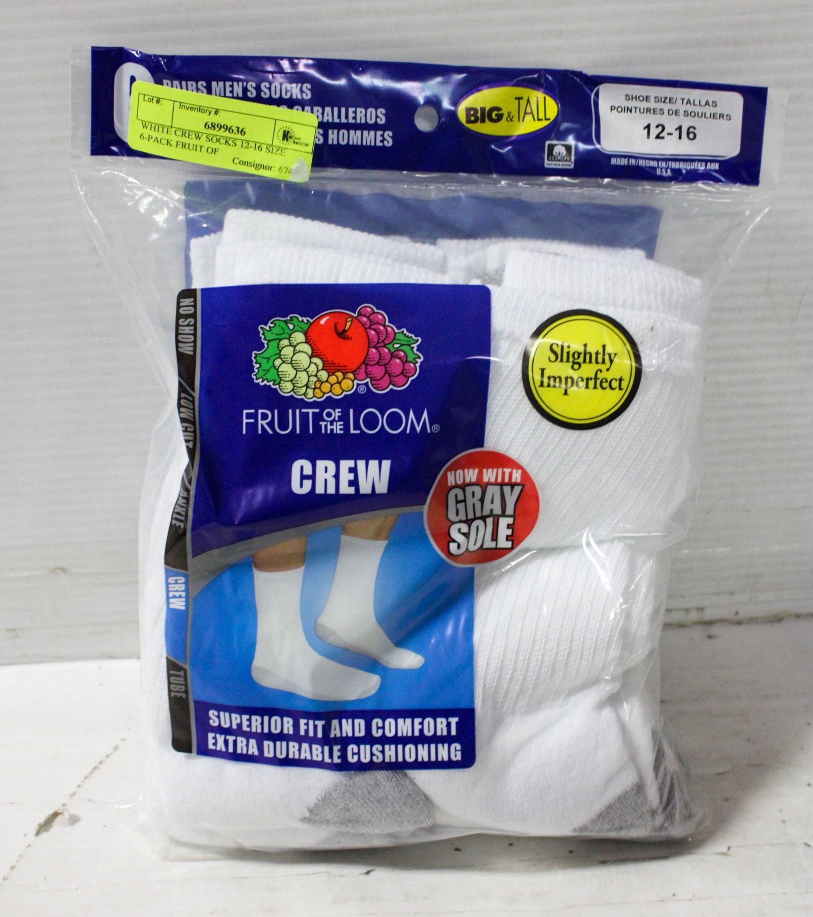 WHITE CREW SOCKS 12-16 SIZE 6-PACK FRUIT OF