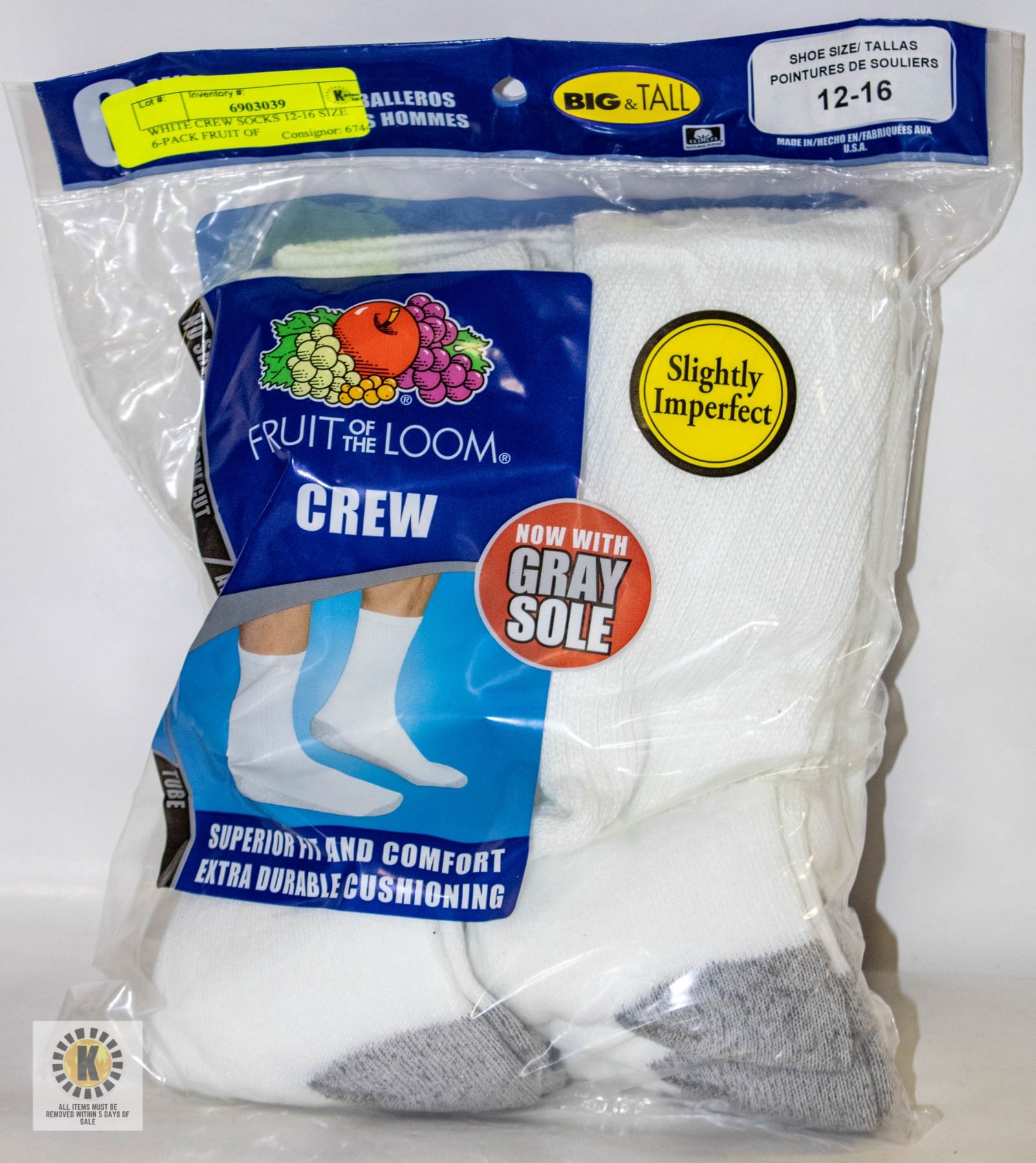WHITE CREW SOCKS 12-16 SIZE 6-PACK FRUIT OF