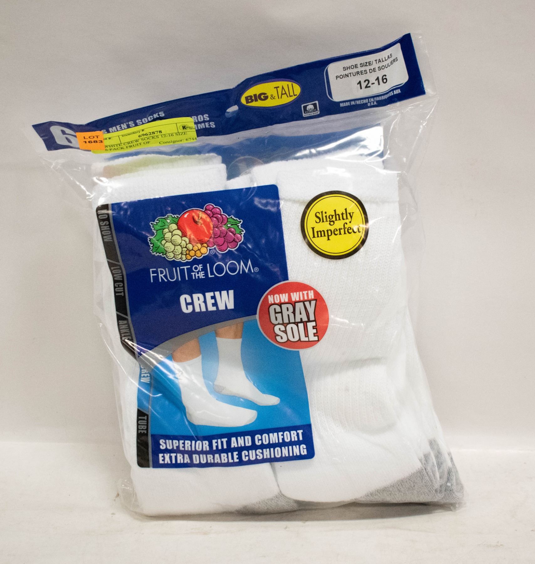 WHITE CREW SOCKS 12-16 SIZE 6-PACK FRUIT OF