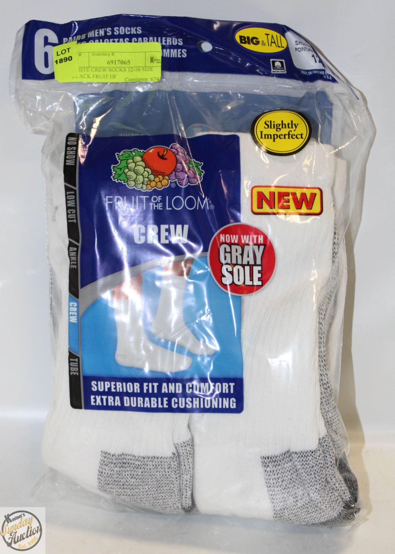 WHITE CREW SOCKS 12-16 SIZE 6-PACK FRUIT OF