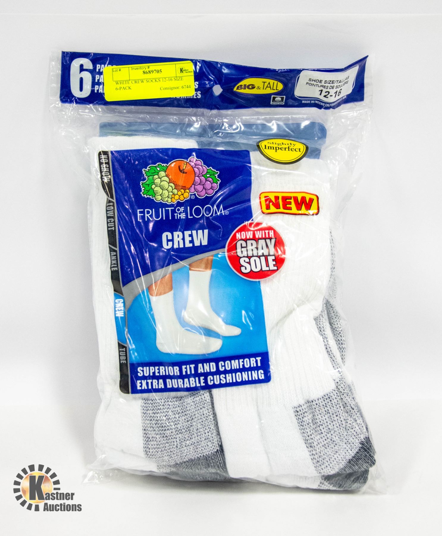 WHITE CREW SOCKS 12-16 SIZE 6-PACK