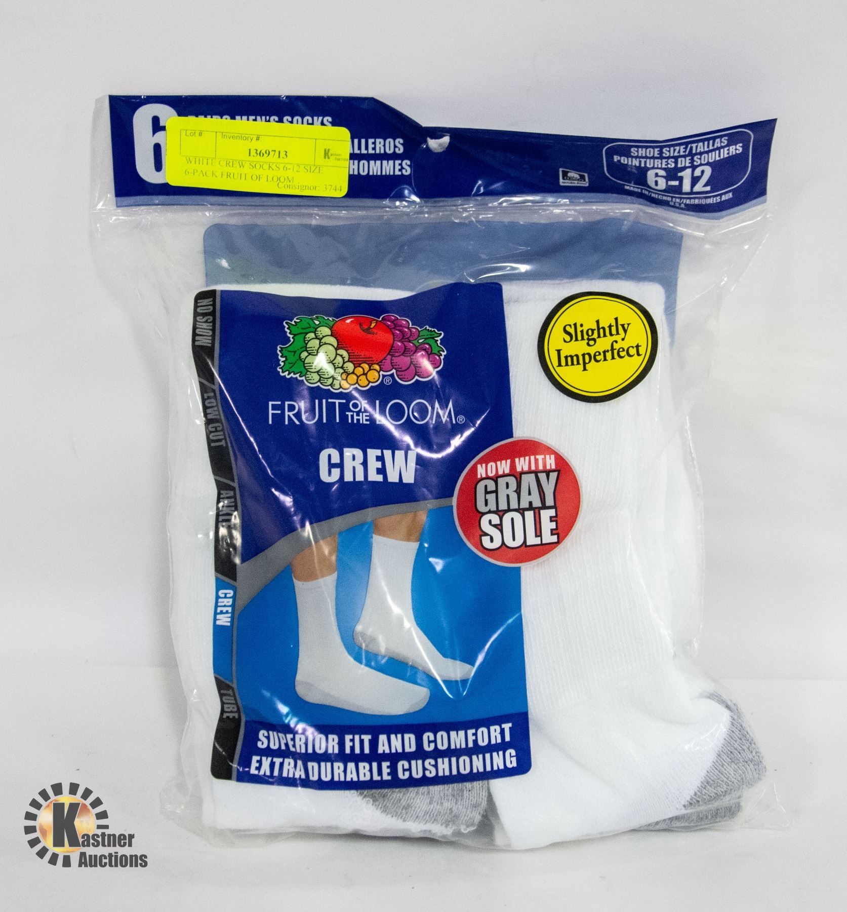WHITE CREW SOCKS 6-12 SIZE 6-PACK FRUIT OF LOOM