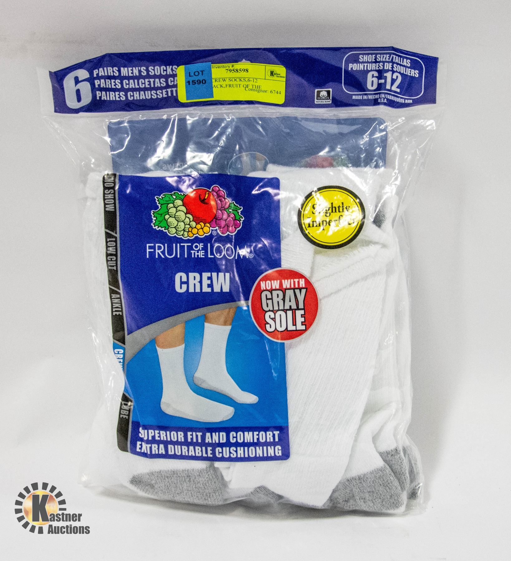 WHITE CREW SOCKS,6-12 SIZE,6-PACK,FRUIT OF THE