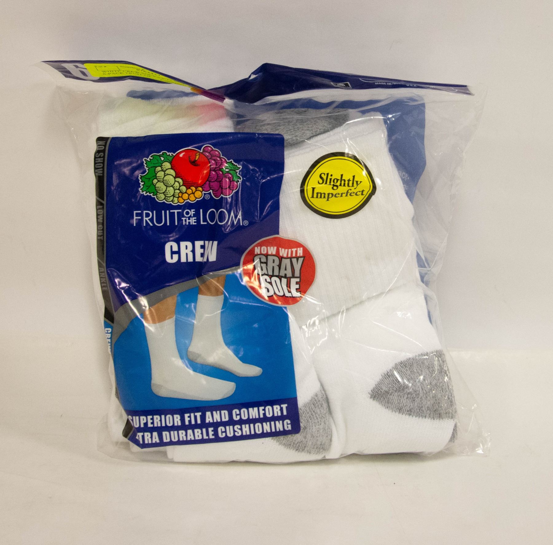 WHITE CREW SOCKS 6-12 SIZE 6-PACK FRUIT OF