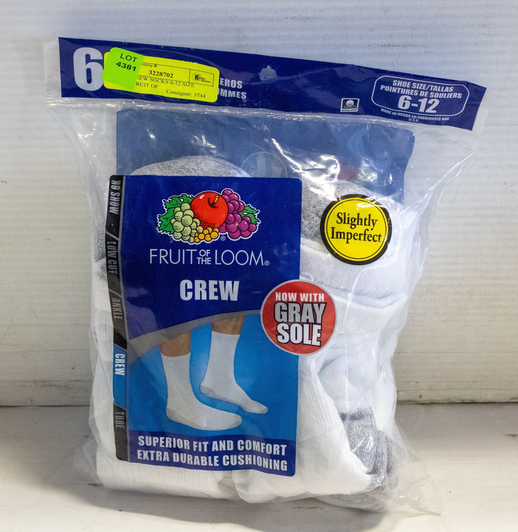 WHITE CREW SOCKS 6-12 SIZE 6-PACK FRUIT OF