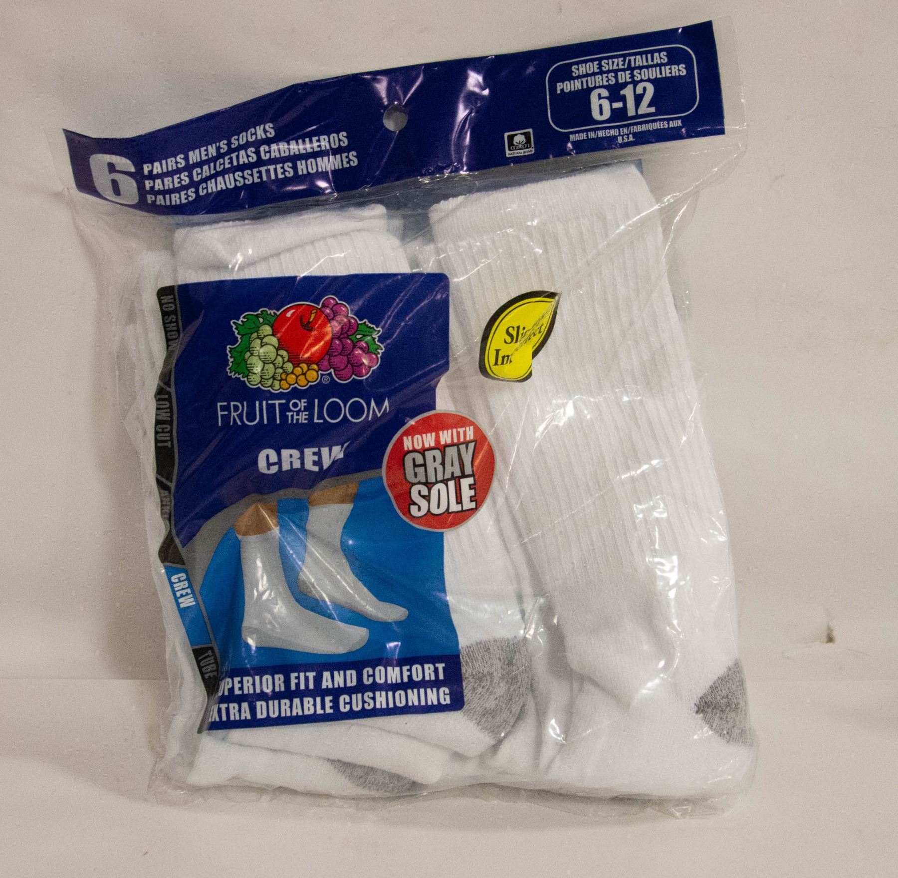 WHITE CREW SOCKS 6-12 SIZE 6-PACK FRUIT OF