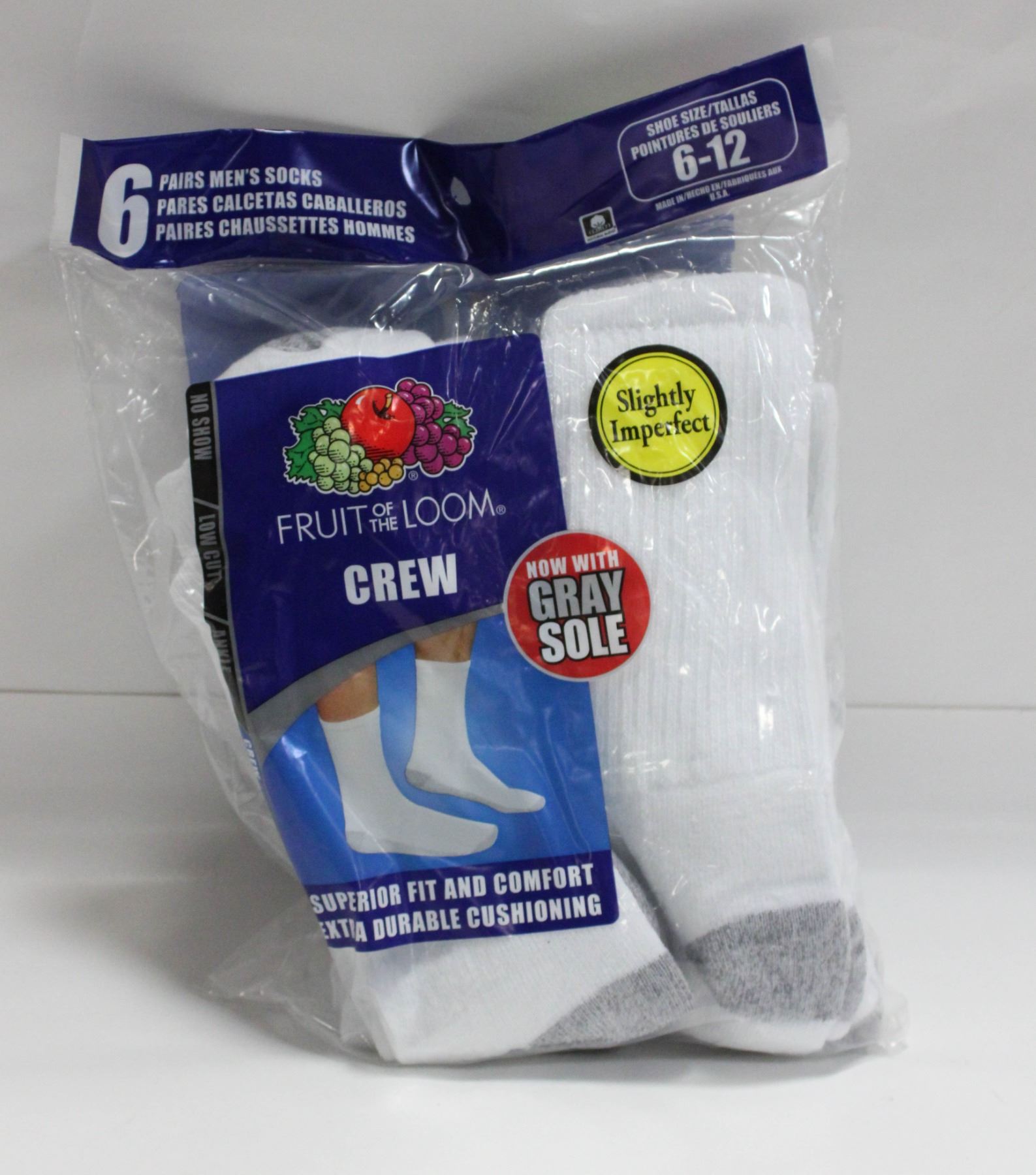 WHITE CREW SOCKS 6-12 SIZE 6-PACK FRUIT OF