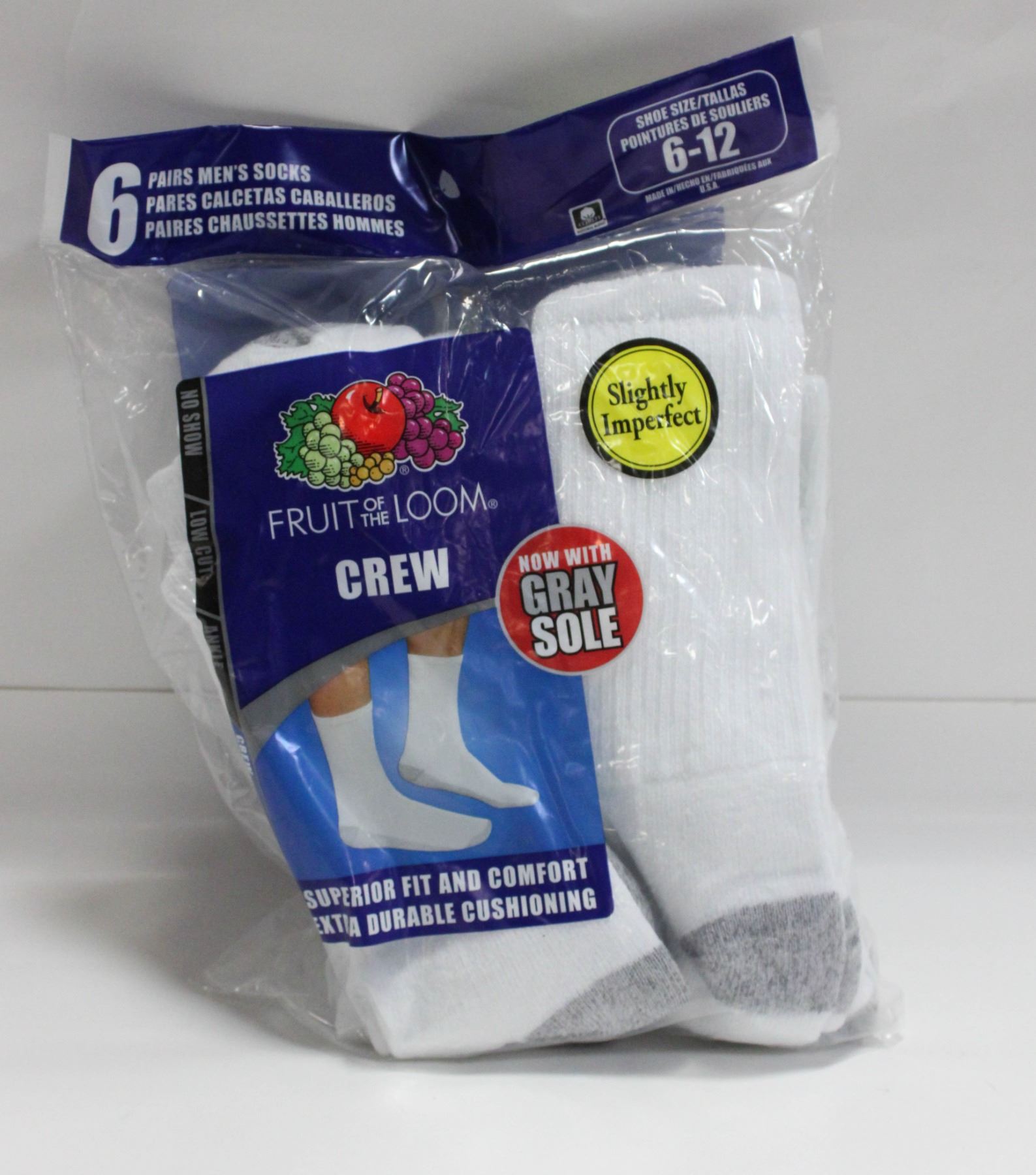 WHITE CREW SOCKS 6-12 SIZE 6-PACK FRUIT OF